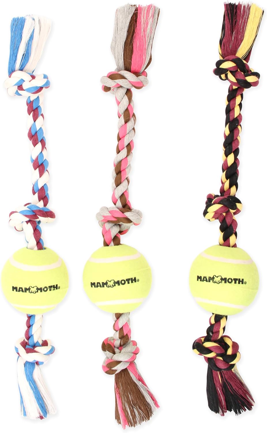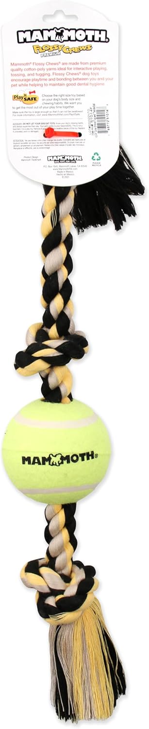 Mammoth Flossy Chews Color 3 Knot Tug w/Large Tennis Ball – Premium Cotton-Poly Tug Toy for Dogs – Interactive Dog Tug Toy – Rope Dog Toy with Tennis Ball for Large Dogs - 24”