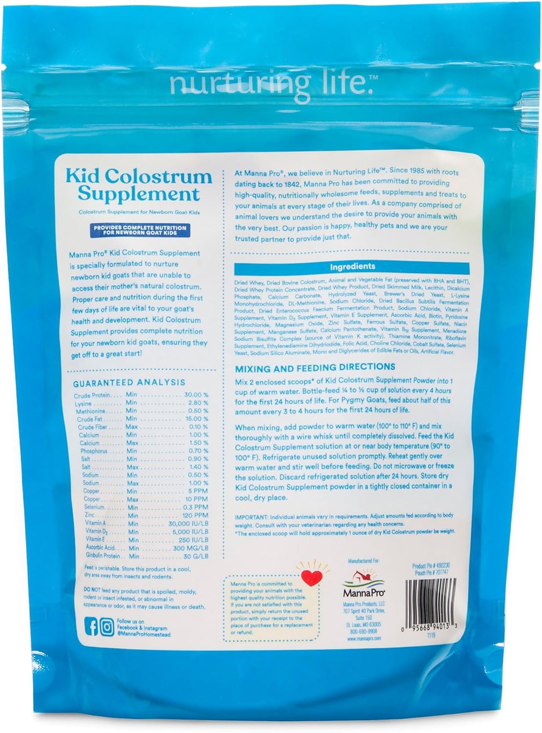 Give newborn goat kids the best start with Manna Pro® Kid Colostrum, a specially formulated supplement for the critical first days of life. Packed with essential nutrients, vitamins, and minerals, it supports natural immunity and promotes healthy, robust growth. Rich in amino acids, this colostrum provides the building blocks for strong development and overall vitality.