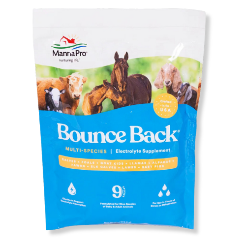 Keep your animals hydrated and energized with Manna Pro Bounce Back® Electrolytes, a trusted multi-species supplement designed for times of stress, dehydration, or recovery. Formulated for 9 species of baby and adult animals, this soluble powder delivers essential electrolytes and energy to support rehydration and overall wellness.