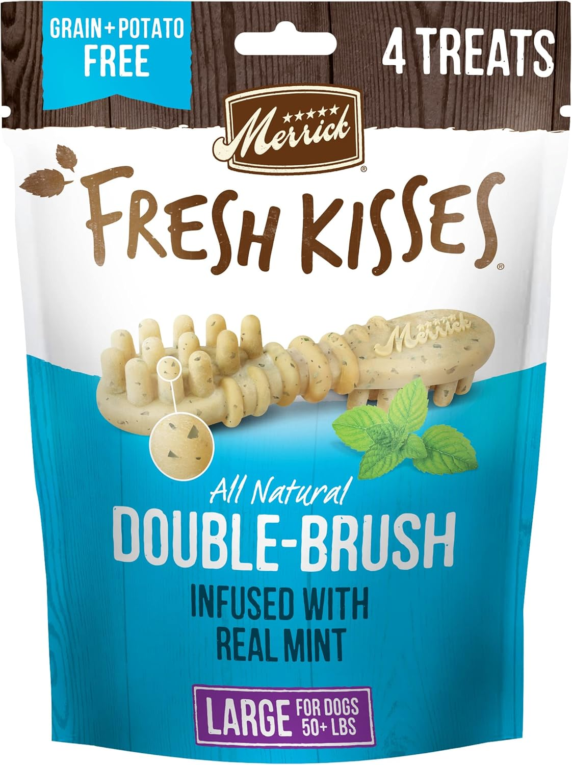 Close cuddles and sweet smooches with your fur buddy just got better with new Merrick Fresh Kisses, an innovative natural dental treat designed not only to clean dogƒ??s teeth but to freshen breath at the same time. While many dental treats effectively reduce plaque and tartar, until now limited options have been available to also freshen breath. Merrick Fresh Kisses do both. The dental treats feature a double-brush design to clean teeth by removing plaque and tartar during the chewing action of the treat. These dental treats are made with natural ingredients specially formulated to freshen breath. Merrick Fresh Kisses are the only dental treat to be both grain-free and potato-free. Made with all-natural ingredients for a healthy dog.