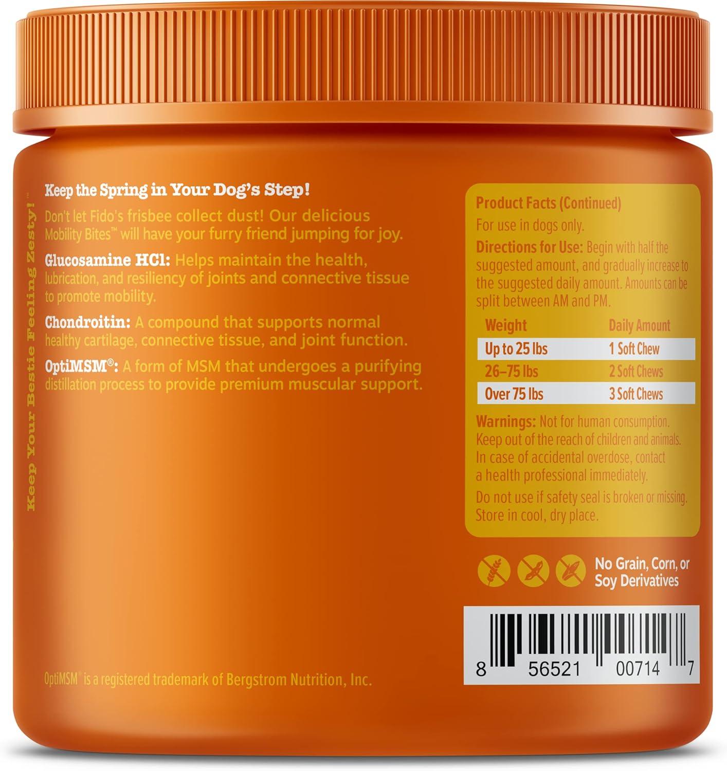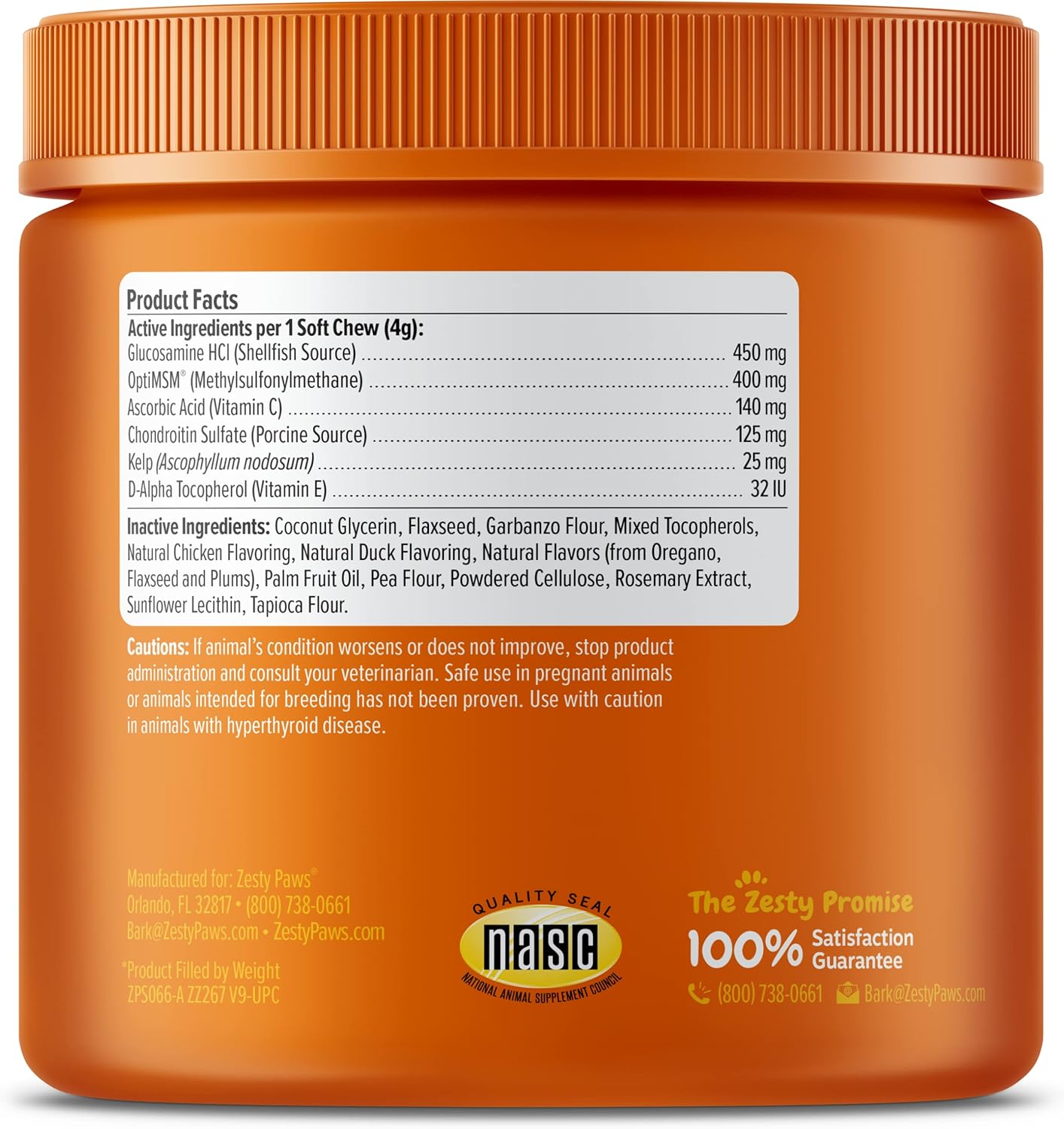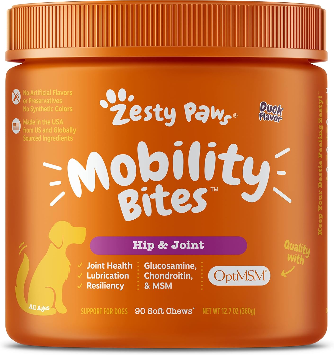 Don't let Fido's frisbee collect dust! Zesty Paws' delicious Mobility Bites are soft chews that provide hip and joint support to keep your furry friend jumping for joy. They're great for adult and even senior furry pals of small, medium, and large sizes. This functional chewable dog supplement features OptiMSM, a premium form of MSM that provides normal muscle support, plus Glucosamine HCl and Chondroitin Sulfate to support hips, joints, connective tissue, and cartilage for dogs. Best of all, pets love the delicious taste that’ll make Fido go wild for more. So trust us, good flavors come natural to us. Also, pet moms and dads can let out a sigh of relief knowing that while their pups are feeling spoiled with special treatment, they'll also be getting the premium support they need for hip and joint function.