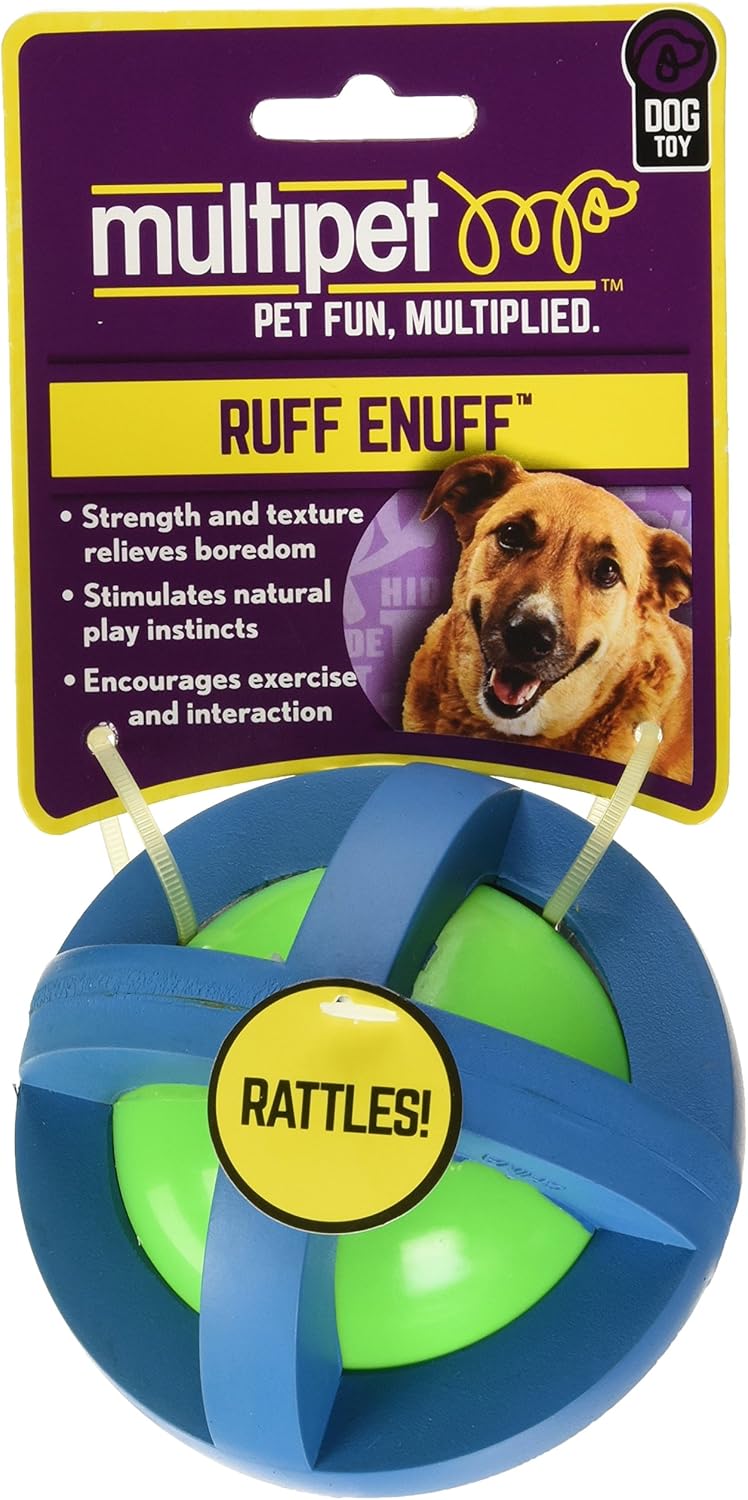 Multipet's 3-1/2-inch Boingo Ball. This plastic sphere is covered by rubber grippers and makes a rattle sound when rolled. This is a great toy for active dogs and aggressive chewers.