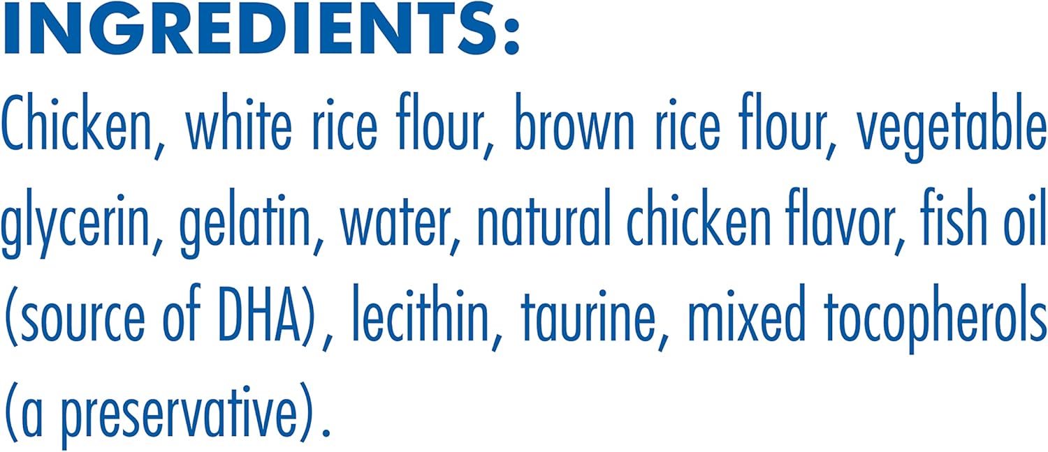 IngredientsChicken, white rice flour, brown rice flour, vegetable glycerin, gelatin, water, natural chicken flavor, fish oil (source of DHA), lecithin, taurine, mixed tocopherols (a preservative).