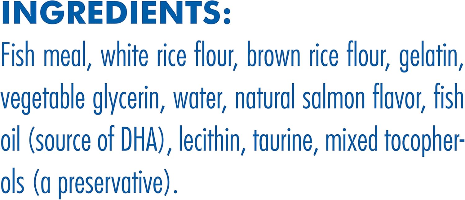 IngredientsFish meal, white rice flour, brown rice flour, gelatin, vegetable glycerin, water, natural salmon flavor, fish oil (source of DHA), lecithin, taurine, mixed tocopherols (a preservative).