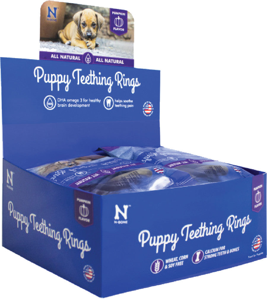 All puppies go through the process of growing new teeth; and while teething, puppies have a strong urge to chew. Deter destructive chewing with N-Bone Puppy Teething Rings. Its unique shape and pliable texture make it an ideal teething aid to alleviate discomfort by massaging gums while your puppy enjoys this delicious treat. N-Bone Puppy Teething Rings are edible and safe to digest, gentle and safe for delicate teeth, and provide a safe outlet for strong chewing urges.
