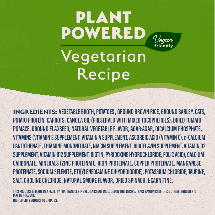 Vegan-friendly recipe with high-quality brown rice, barley, and oat groats. Plant powered protein helps support healthy muscles abd highly-digestible potatoes and peas provide complex carbohydrates. Ideal for households who prefer a vegan lifestyle or for dogs with food sensitivities. Complete and balanced alternative to a meat-based diet for adult dogs