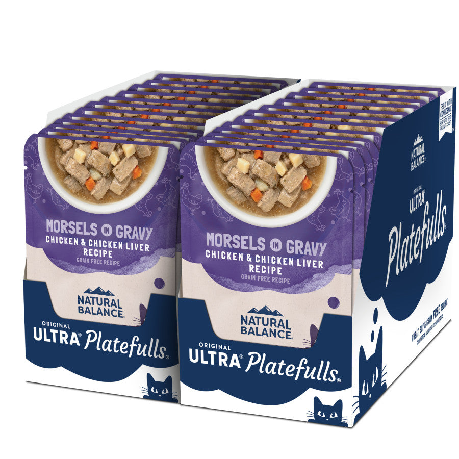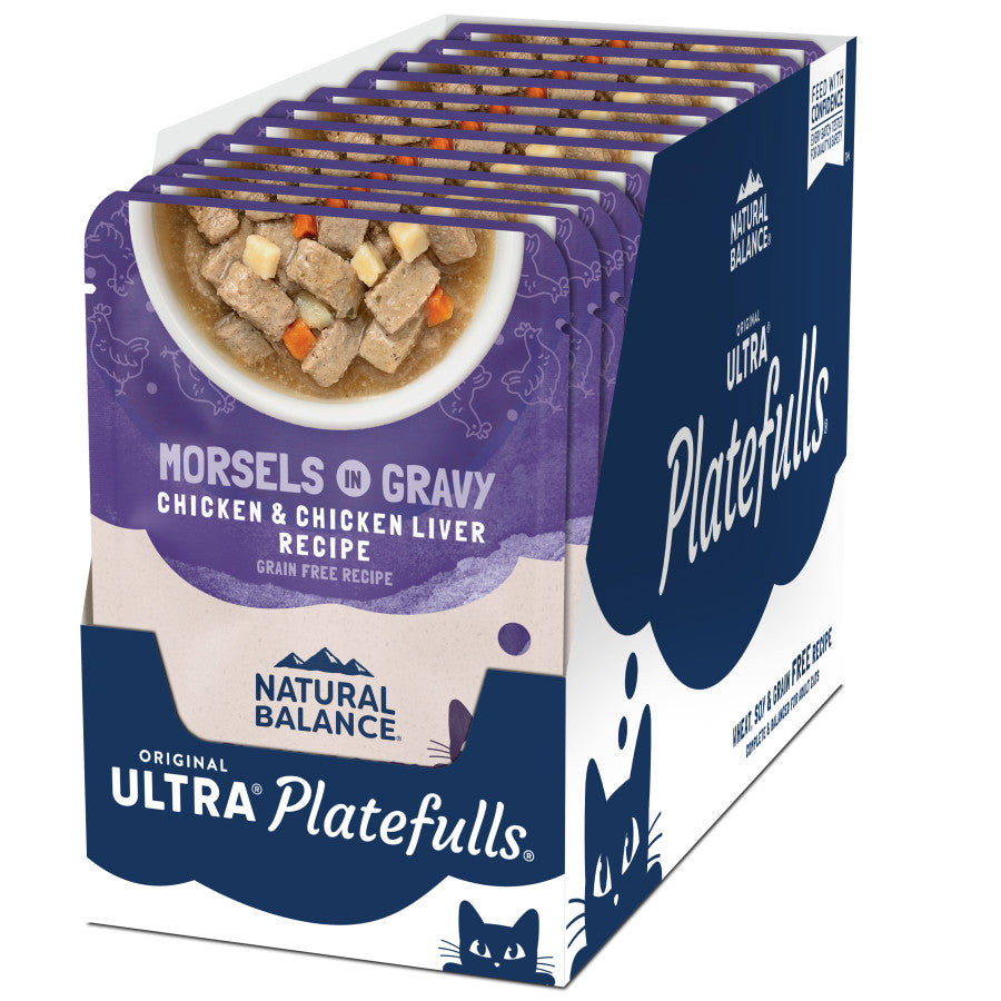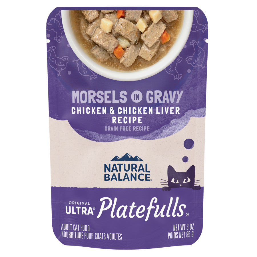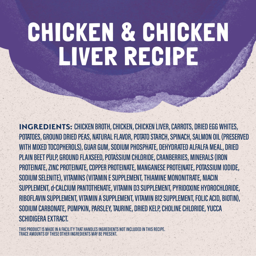 Tender morsels in a savory gravy featuring high quality chicken and chicken liver complimented with carrots and potatoes. Serve as a topper or complete and balanced meal for adult cats. Wheat, soy, and grain free recipe.