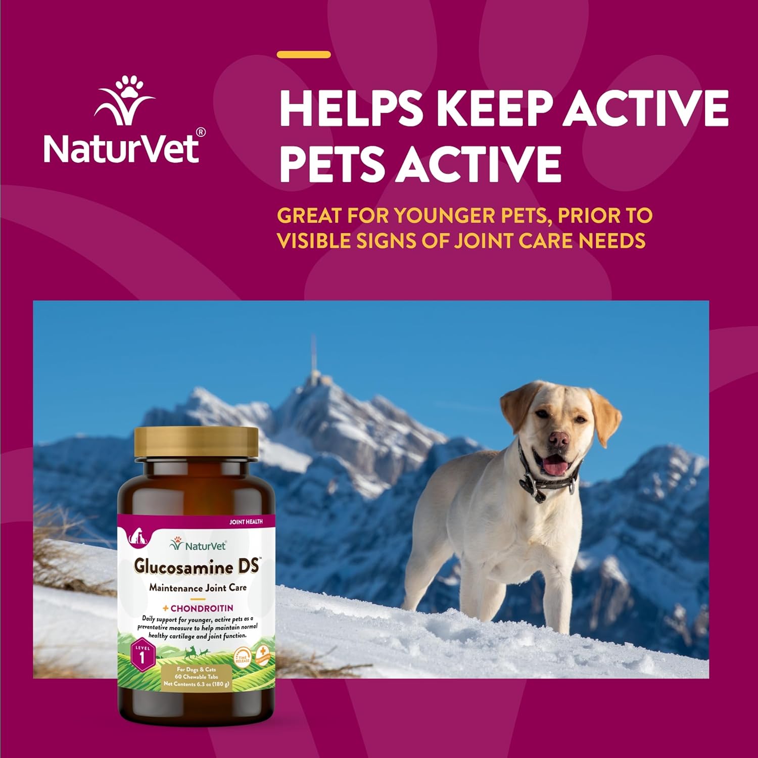 NaturVet Glucosamine DS Level 1 Maintenance Care Hip & Joint Support Pet Supplement for Dogs & Cats –Glucosamine, Chondroitin, Antioxidants –Supports Cartilage, Joint Function – 60 Ct.