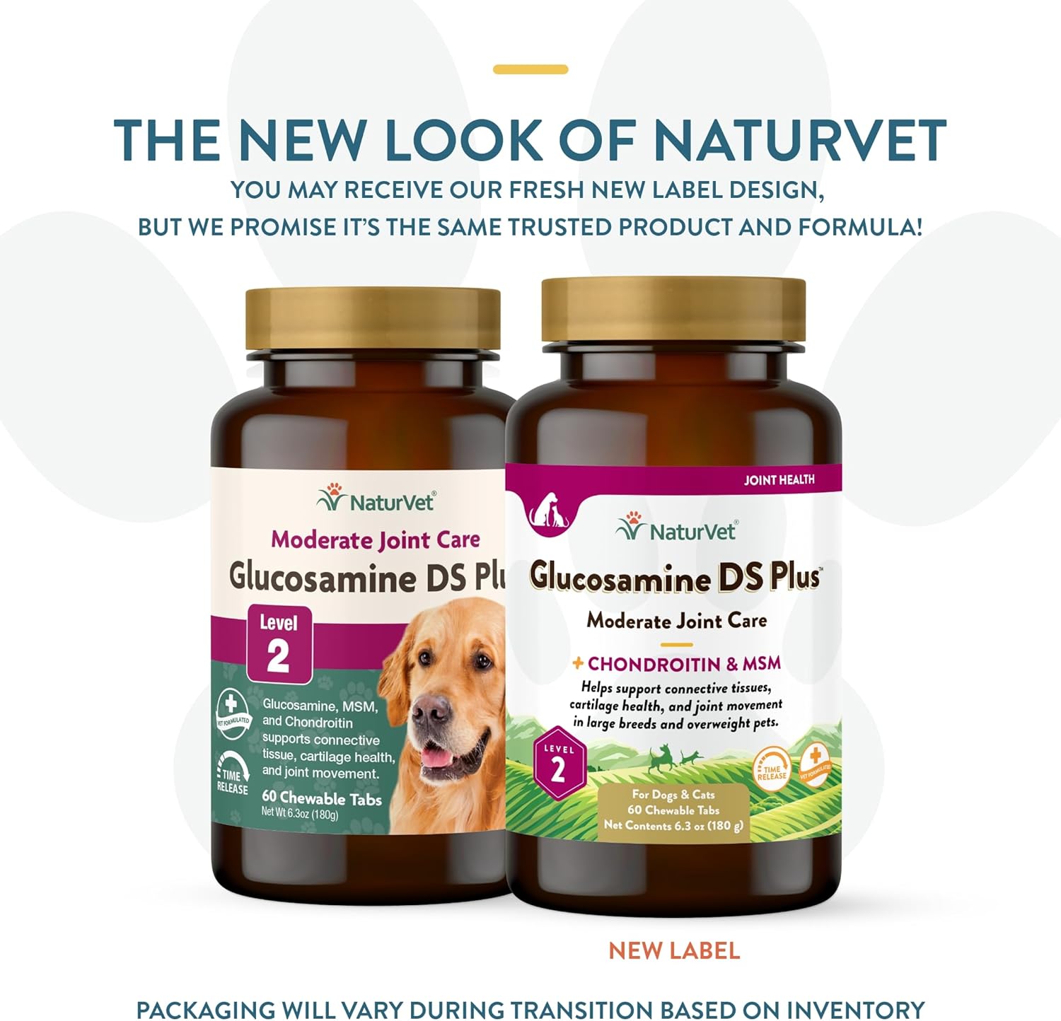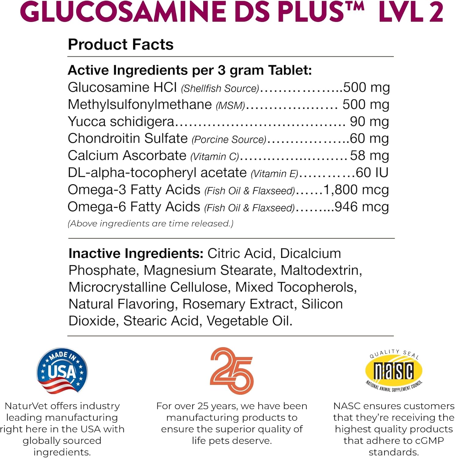 NaturVet Glucosamine DS Plus Level 2 Moderate Care Joint Support Supplement for Dogs and Cats, Chewable Tablets Time Release, Made in The USA, 60 Count