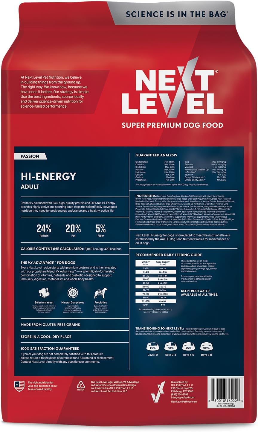 Next Level Super Premium Dog Food – HI-Energy – Dry Kibble for Adult Dogs of All Breeds – 24% Protein. Beef, Chicken, Pork & Fish Meal Proteins & Gluten Free Grains for Active Sporting Dogs 40 lb