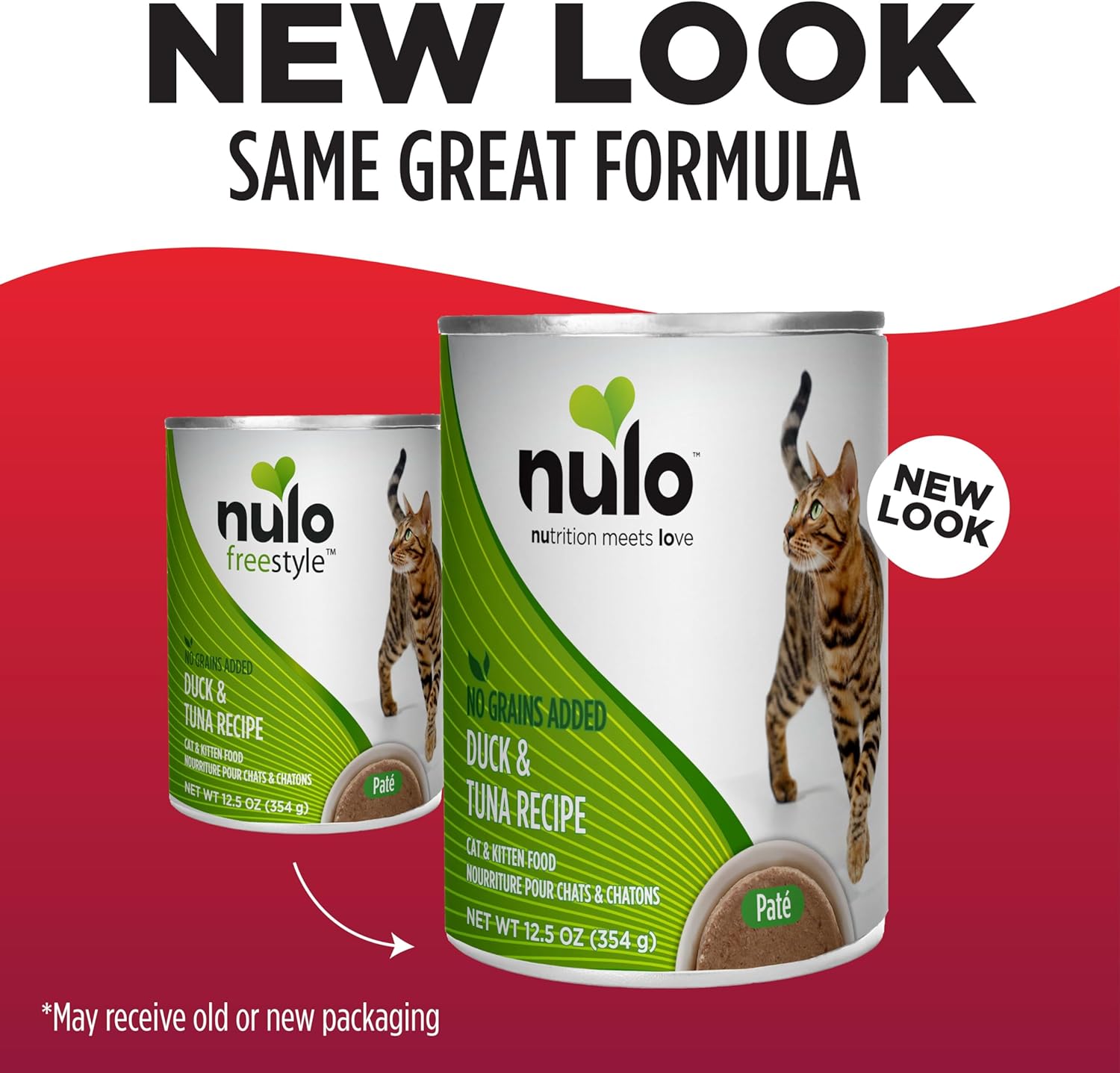 - DUCK & TUNA RECIPE - Nulo Freestyle Cat & Kitten Wet Pate Canned Cat Food features our proprietary blend of grain-free proteins and vitamins ideal for cats with diagnosed grain allergies and sensitivities. Pack of 12, 12.5 Oz each.