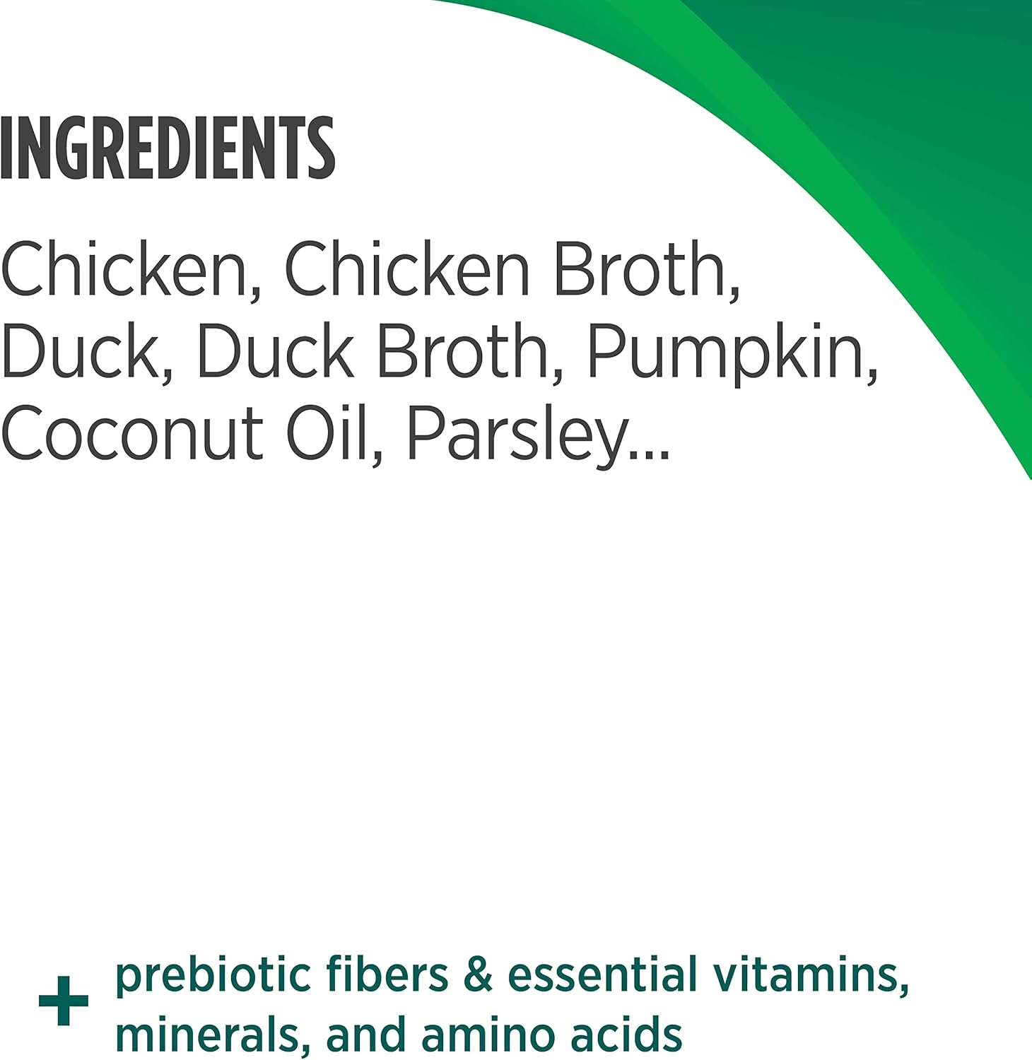 Chicken, Chicken Broth, Duck, Duck Broth, Pumpkin, Coconut Oil, Tricalcium Phosphate, Potassium Chloride, Xanthan Gum, Salt, Inulin, Guar Gum, Choline Chloride, Taurine, Magnesium Sulfate, Salmon Oil, Parsley, Iron Amino Acid Chelate, Zinc Amino Acid Chelate, Vitamin E Supplement, L-Ascorbyl-2-Polyphosphate, Thiamine Mononitrate, Vitamin A Supplement, Nicotinic Acid, Manganese Amino Acid Chelate, Calcium Iodate, Copper Amino Acid Chelate, Calcium Pantothenate, Riboflavin Supplement, Sodium Selenite, Vitamin B12 Supplement, Pyridoxine Hydrochloride, Folic Acid, Cholecalciferol, Biotin, Menadione Sodium Bisulfite Complex.