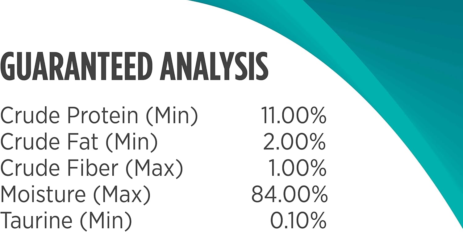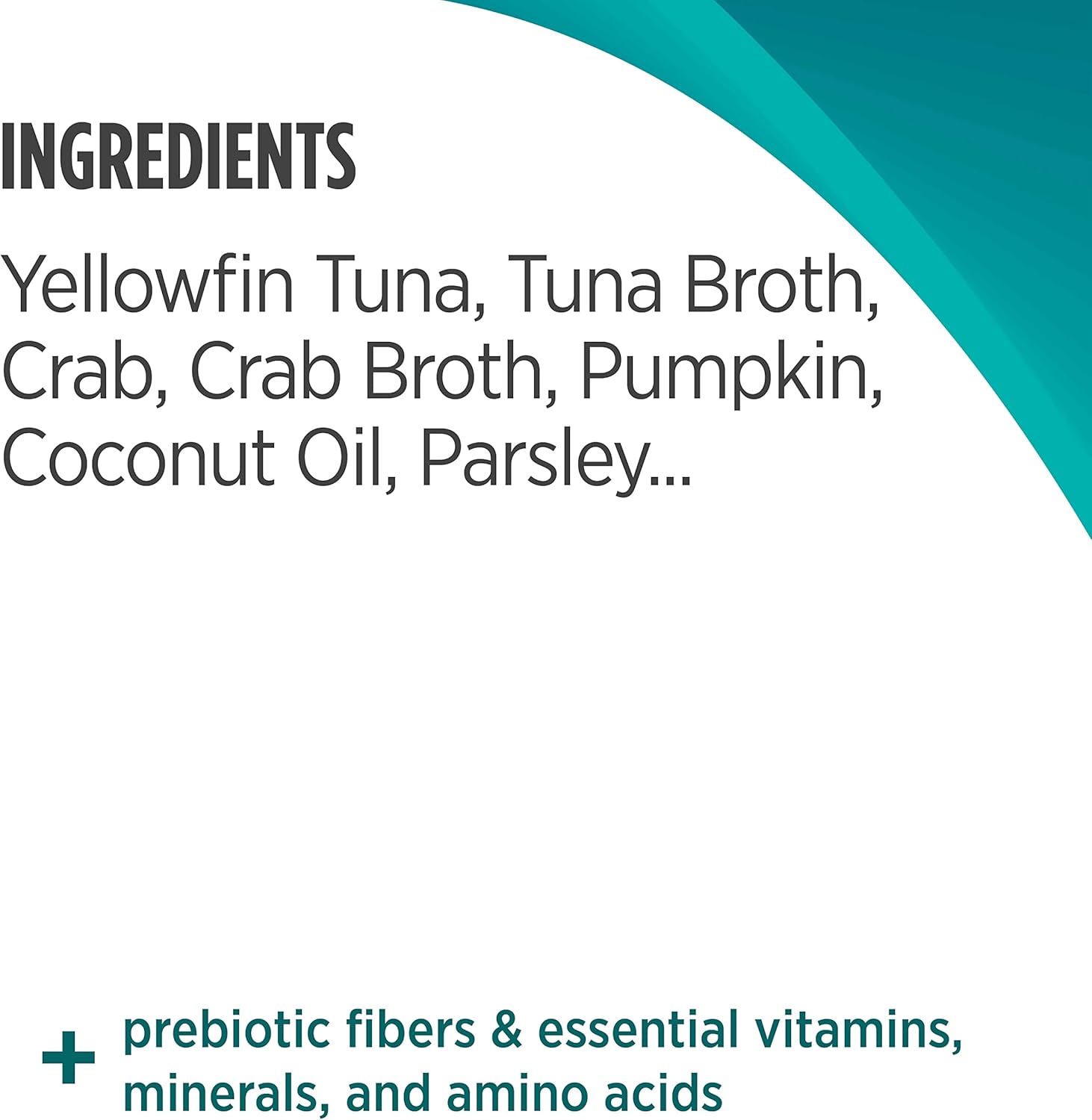 Yellowfin Tuna, Tuna Broth, Crab, Crab Broth, Pumpkin, Coconut Oil, Tricalcium Phosphate, Potassium Chloride, Xanthan Gum, Salt, Inulin, Guar Gum, Choline Chloride, Taurine, Magnesium Sulfate, Parsley, Iron Amino Acid Chelate, Zinc Amino Acid Chelate, Vitamin E Supplement, L-Ascorbyl-2-Polyphosphate, Thiamine Mononitrate, Vitamin A Supplement, Nicotinic Acid, Manganese Amino Acid Chelate, Calcium Iodate, Copper Amino Acid Chelate, Calcium Pantothenate, Riboflavin Supplement, Sodium Selenite, Vitamin B12 Supplement, Pyridoxine Hydrochloride, Folic Acid, Cholecalciferol, Biotin, Menadione Sodium Bisulfite Complex.