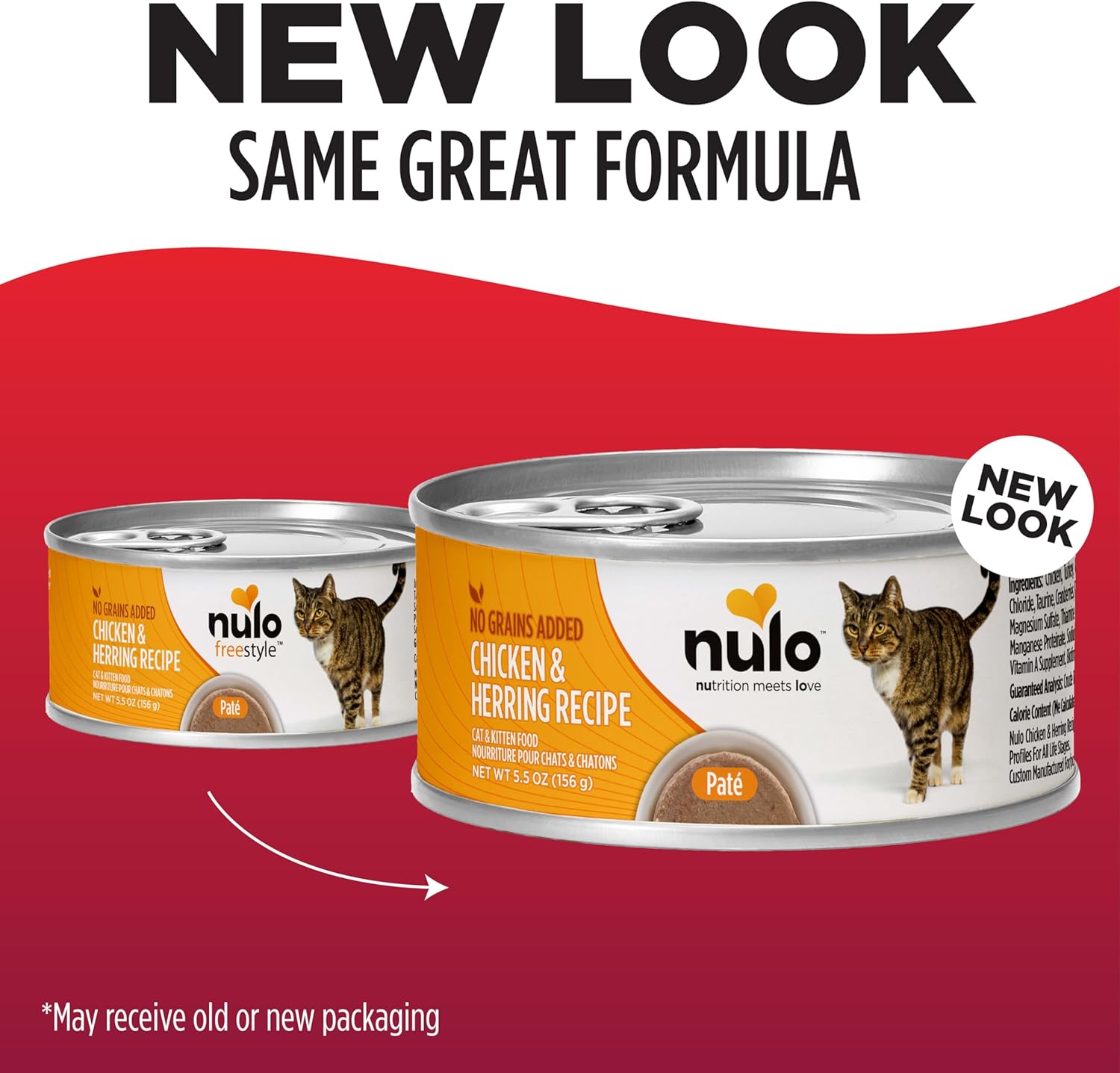 - CHICKEN & HERRING RECIPE -Nulo Freestyle Cat & Kitten Wet Pate Canned Cat Food features our proprietary blend of grain-free proteins and vitamins ideal for cats with diagnosed grain allergies and sensitivities. Pack of 24, 5.5 Oz each.