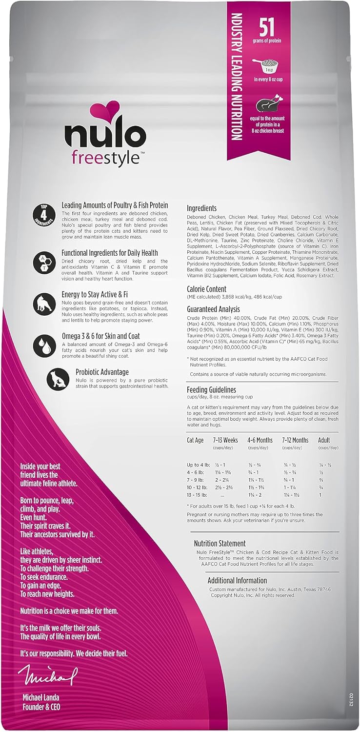 - Taurine for Heart and Vision – Fortified with taurine, an essential nutrient that supports heart function, vision health, and overall well-being. Nulo’s small disc-shaped kibble helps support a healthy heart and an active life for your kitten or adult cat.