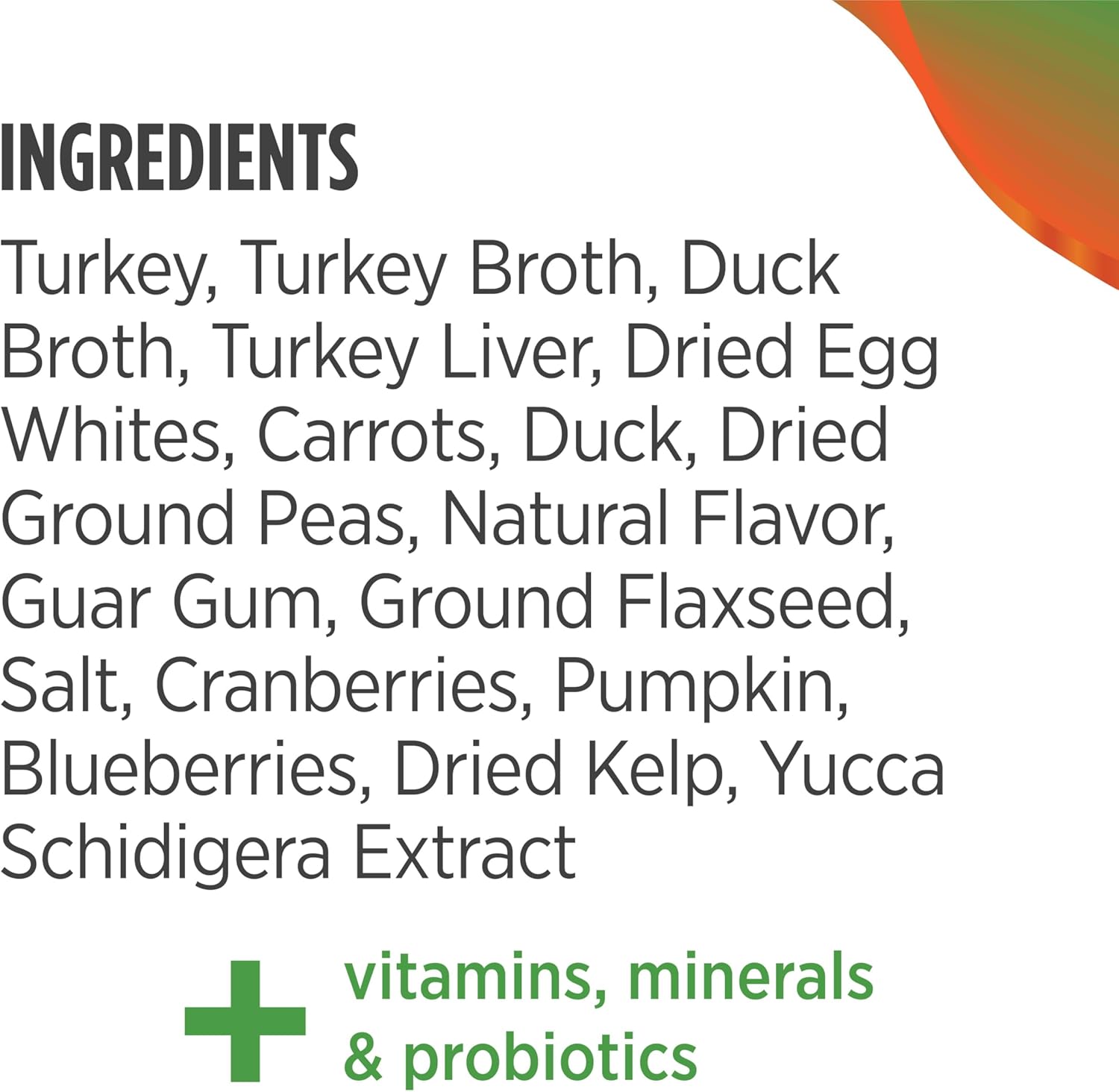 Turkey, Turkey Broth, Duck Broth, Turkey Liver, Dried Egg Whites, Carrots, Duck, Dried Ground Peas, Natural Flavor, Guar Gum, Ground Flaxseed, Sodium Phosphate, Salt, Potassium Chloride, Choline Chloride, Taurine, Cranberries, Pumpkin, Blueberries, Dried Kelp, Yucca Schidigera Extract, Inulin, Iron Proteinate, Zinc Proteinate, Flaxseed Oil, Vitamin E Supplement, Thiamine Mononitrate, Copper Proteinate, Manganese Proteinate, Sodium Selenite, Niacin Supplement, D-calcium Pantothenate, Pyridoxine Hydrochloride, Riboflavin Supplement, Vitamin A Supplement, Biotin, Potassium Iodide, Vitamin D3 Supplement, Vitamin B12 Supplement, Folic Acid.