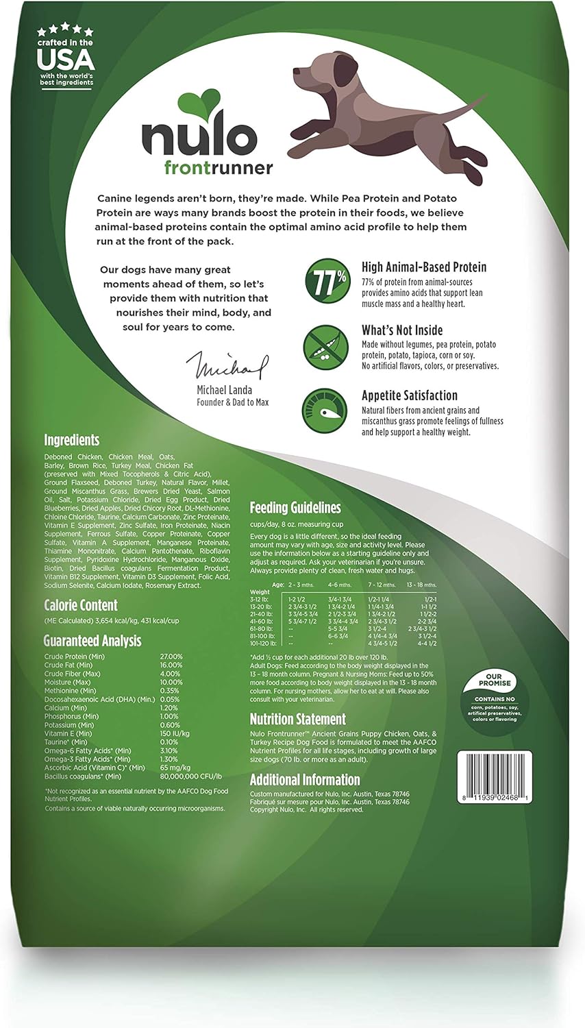 - FRONT OF THE PACK: Canine legends aren’t born - they’re made. Start your puppy’s legend with all the nutrition they need with the Nulo Frontrunner Puppy Dog Food with Chicken, Oats & Turkey. A balanced meal your pet is sure to love!