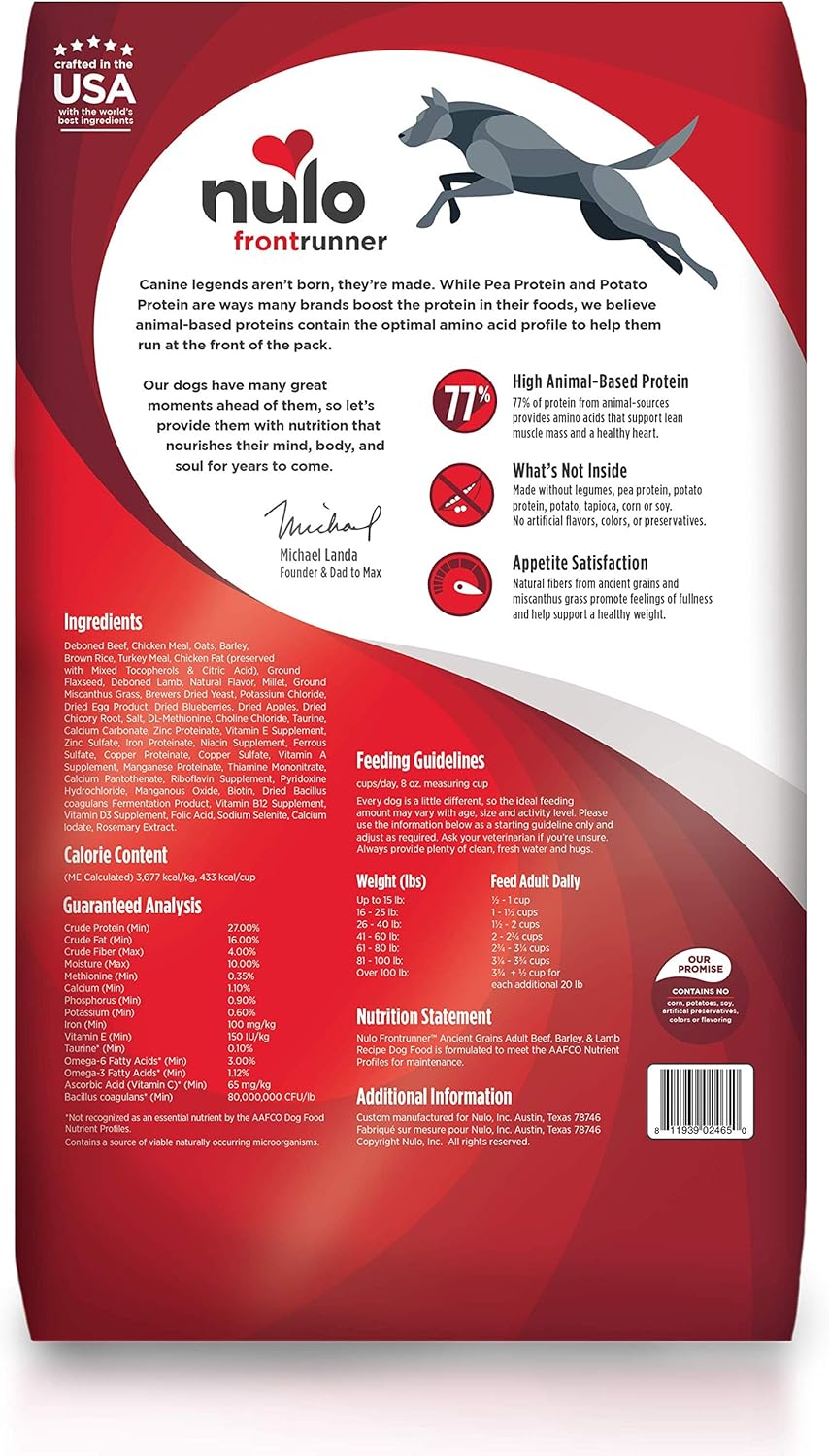 - FOSTERS A HEALTHY HEART: This dog food with beef, barley, and lamb, has a guaranteed level of taurine and Omega 3 which helps foster a strong cardiovascular system. So be a frontrunner, shop Nulo, become the leader of the pack.