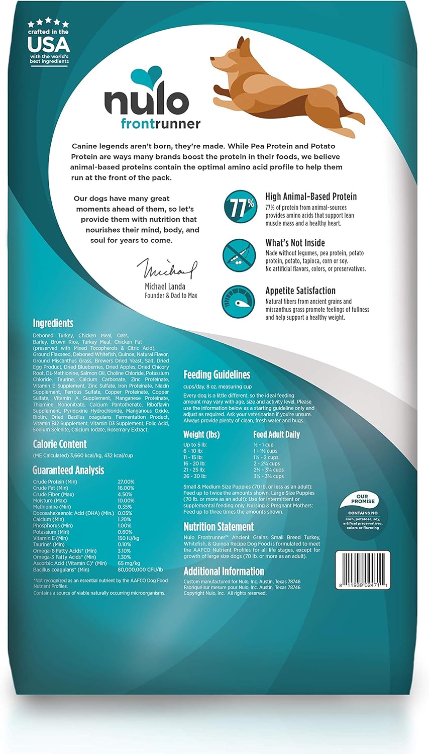 - THE FRONT OF THE PACK: Canine legends aren’t born - they’re made. Ensure your dog has the nutrition they need with the Nulo Frontrunner Small Breed Dog Food, which features a formula of 77% animal-based protein and healthy ancient grains.