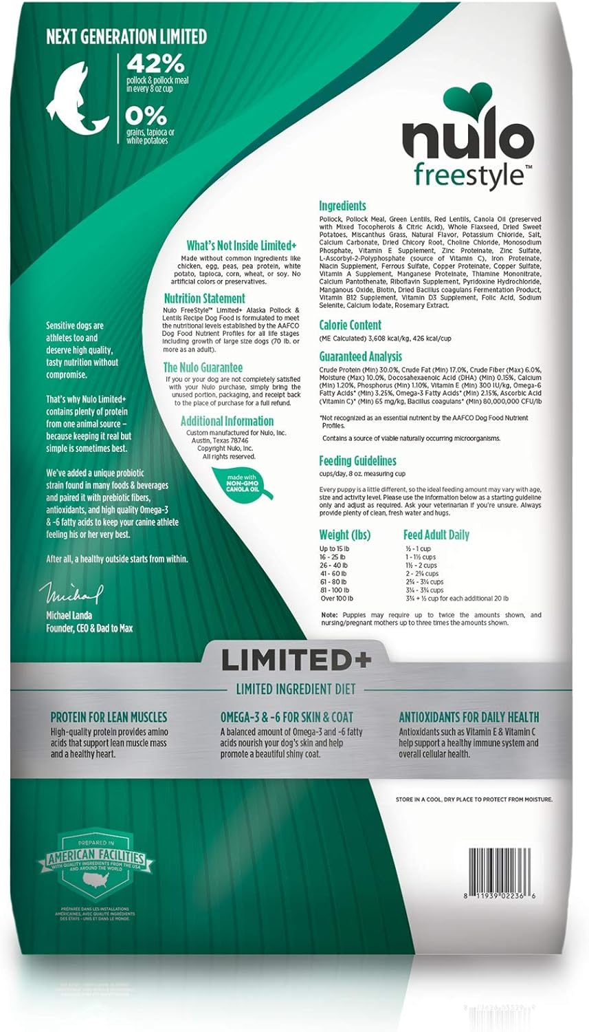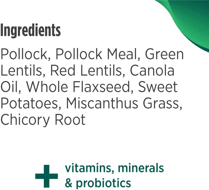 Pollock, Pollock Meal, Green Lentils, Red Lentils, Canola Oil (preserved with Mixed Tocopherols & Citric Acid), Whole Flaxseed, Dried Sweet Potatoes, Miscanthus Grass, Natural Flavor, Potassium Chloride, Salt, Calcium Carbonate, Dried Chicory Root, Choline Chloride, Monosodium Phosphate, Vitamin E Supplement, Zinc Proteinate, Vitamin E Supplement, Zinc Sulfate, L-Ascorbyl-2-Polyphosphate (source of Vitamin C), Iron Proteinate, Niacin Supplement, Ferrous Sulfate, Copper Proteinate, Copper Sulfate, Vitamin A Supplement, Manganese Proteinate, Thiamine Mononitrate, Calcium Pantothenate, Riboflavin Supplement, Pyridoxine Hydrochloride, Manganous Oxide, Biotin, Dried Bacillus coagulans Fermentation Product, Vitamin B12 Supplement, Vitamin D3 Supplement, Folic Acid, Sodium Selenite, Calcium Iodate, Rosemary Extract.
