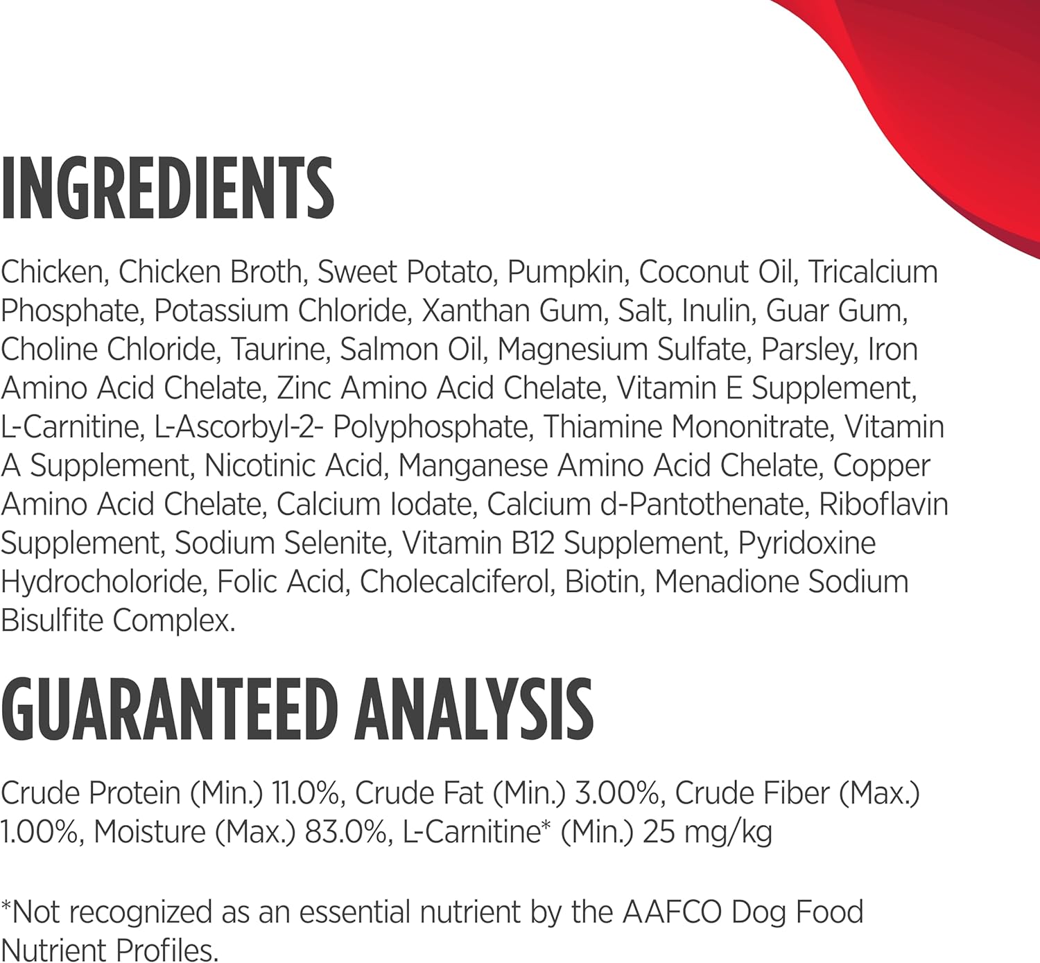 Chicken, Chicken Broth, Sweet Potato, Pumpkin, Coconut Oil, Tricalcium Phosphate, Potassium Chloride, Xanthan Gum, Salt, Inulin, Guar Gum, Choline Chloride, Taurine, Salmon Oil, Magnesium Sulfate, Parsley, Iron Amino Acid Chelate, Zinc Amino Acid Chelate, Vitamin E Supplement, L-Ascorbyl-2-Polyphosphate, Thiamine Mononitrate, Vitamin A Supplement, Nicotinic Acid, Manganese Amino Acid Chelate, Copper Amino Acid Chelate, Calcium Iodate, Calcium d-Pantothenate, Riboflavin Supplement, Sodium Selenite, Vitamin B12 Supplement, Pyridoxine Hydrocholoride, Folic Acid, Cholecalciferol, Biotin, Menadione Sodium Bisulfite Complex.
