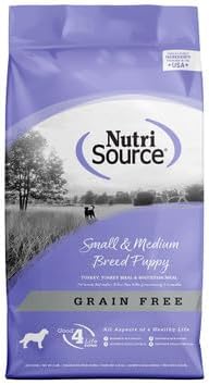 NutriSource Grain Free Small and Medium Breed Puppy is ideal for breeds that mature to less than 50 lbs. NutriSourcereg puppy formulas deliver super premium nutrition in a holistically formulated, easytodigest food. Our puppy cuisine contains higher levels of protein and fat needed to fuel your new pups growth and development. We combine humanely certified turkey, Lowash turkey meal and low glycemic North American green and red lentils and carefully selected holistic ingredients to promote balanced growth and unparalleled health for your small to medium size puppy. Health of your beloved pet is our 1 priority and our unmatched use of Good 4 Life supplements guarantees the new addition to your family wont have any runny stool issues and a healthier immune system, we guarantee it. Bioavailability is important to your pets longterm health so we created a smaller, bite size morsel making it easier for small dogs to eat with a 85 digestibility rating Health begins here