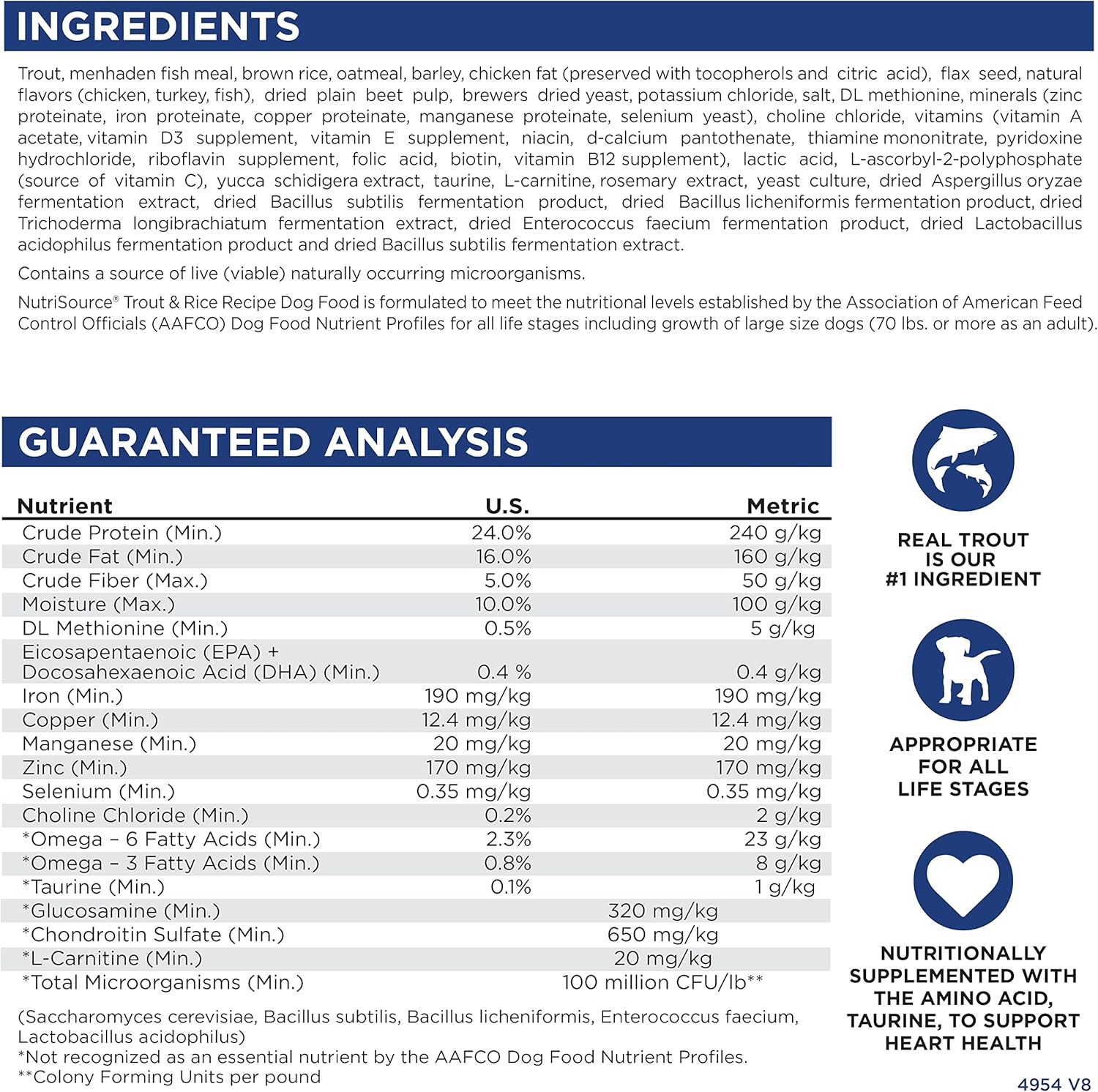 Brand NutriSource Flavor Trout and Rice Age Range (Description) All Life Stages Item Form Dry Specific...