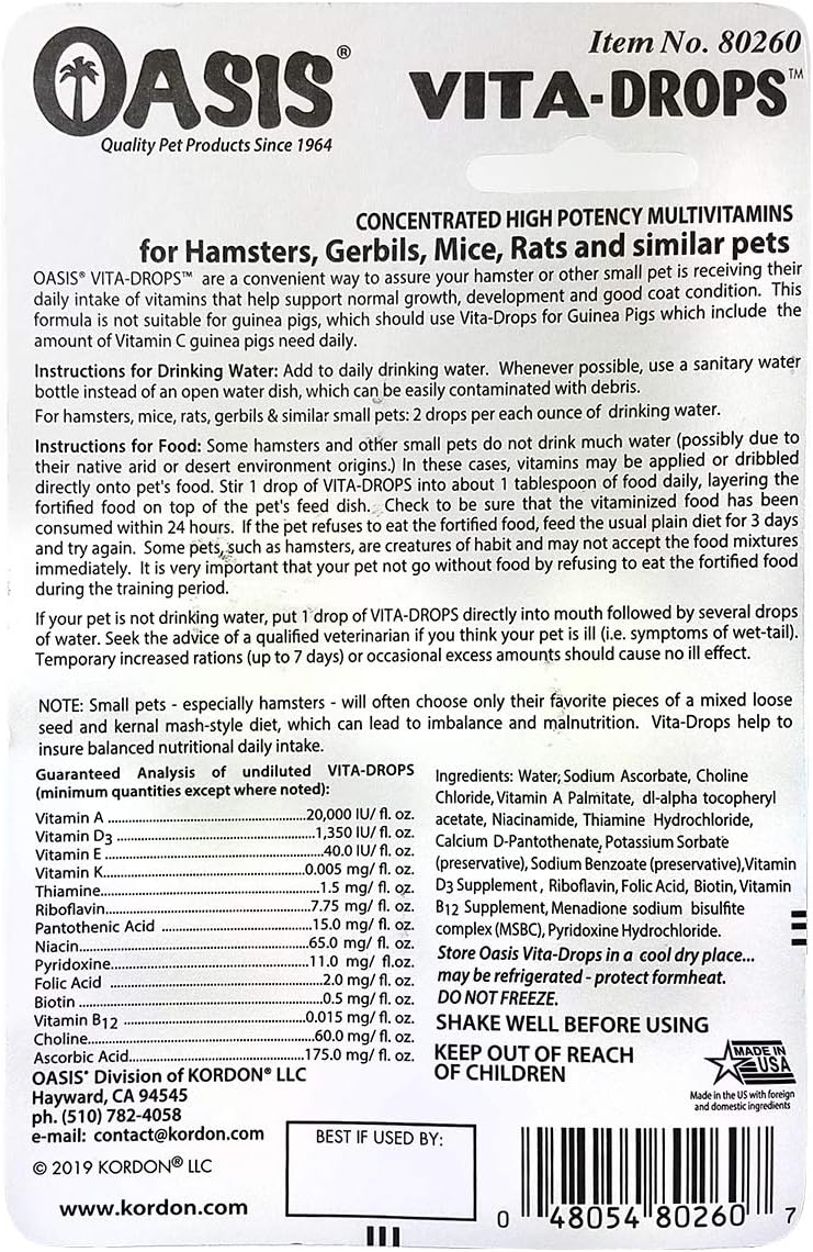 Oasis Hamster Vita-Drops All-in-1 Multivitamins - Daily Vitamin Supplement Supports Healthy Bones & Teeth, Joints & Digestion, Promotes Healthy Skin Coat, Orange Flavor, 2-Ounces