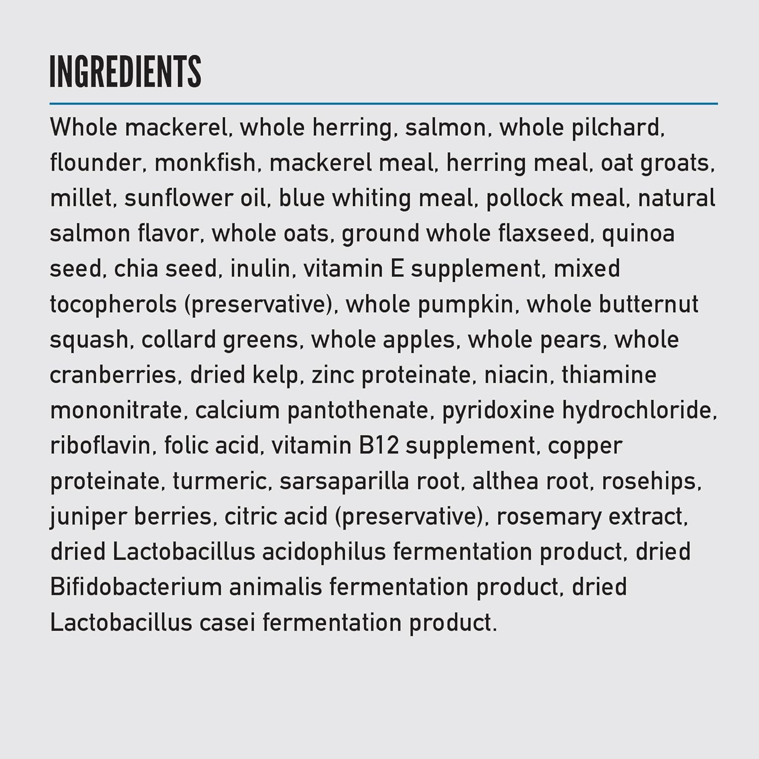 IngredientsWhole mackerel, whole herring, salmon, whole pilchard, flounder, monkfish, mackerel meal, herring meal, oat groats, millet, sunflower oil, blue whiting meal, pollock meal, natural salmon flavor, whole oats, ground whole flaxseed, quinoa seed, chia seed, inulin, vitamin E supplement, mixed tocopherols (preservative), whole pumpkin, whole butternut squash, collard greens, whole apples, whole pears, whole cranberries, dried kelp, zinc proteinate, niacin, thiamine mononitrate, calcium pantothenate, pyridoxine hydrochloride, riboflavin, folic acid, vitamin B12 supplement, copper proteinate, turmeric, sarsaparilla root, althea root, rosehips, juniper berries, citric acid (preservative), rosemary extract, dried Lactobacillus acidophilus fermentation product, dried Bifidobacterium animalis fermentation product, dried Lactobacillus casei fermentation product.