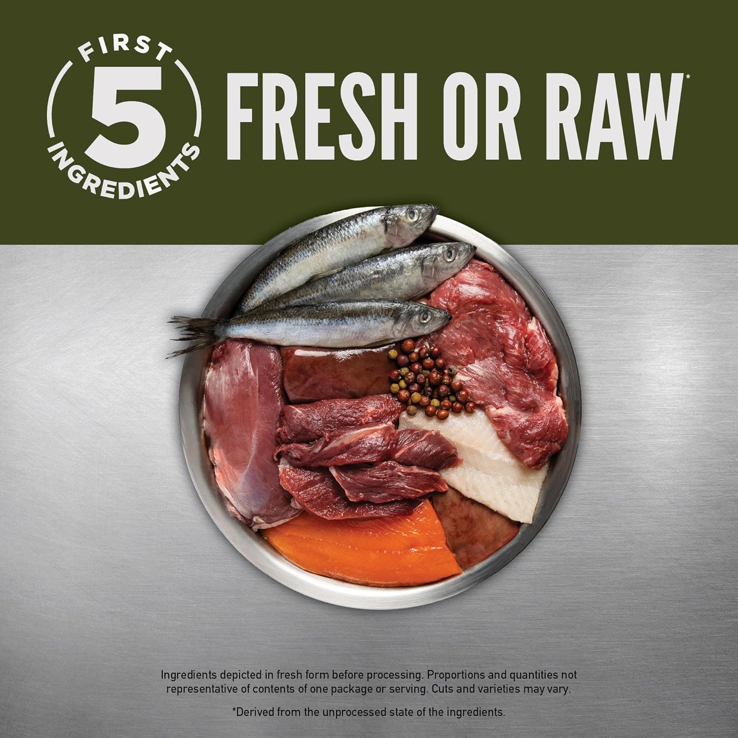 IngredientsDuck, arctic char, rainbow trout, venison, duck liver, pollock meal, sardine meal, herring meal, lamb meal, pork fat, whole red lentils, whole pinto beans, whole green lentils, lamb, whole herring, pork liver, natural fish flavor, lamb liver, whole navy beans, whole peas, dehydrated salmon, duck meal, mackerel meal, pollock oil, lentil fiber, lamb kidney, pork kidney, lamb tripe, whole cranberries, dried kelp, vitamin E supplement, zinc proteinate, mixed tocopherols (preservative), whole pumpkin, whole butternut squash, collard greens, whole pears, whole apples, dried Bacillus coagulans fermentation product, dried chicory root, turmeric, sarsaparilla root, althea root, rosehips, juniper berries, thiamine mononitrate, niacin, pyridoxine hydrochloride, citric acid (preservative), rosemary extract.