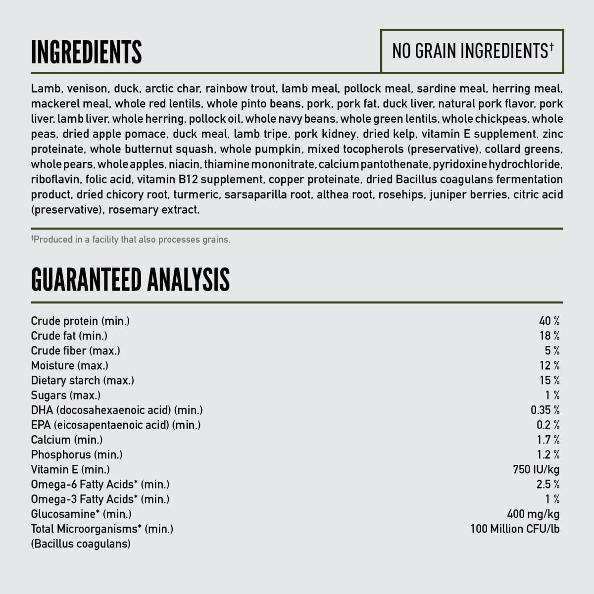 IngredientsLamb, venison, duck, arctic char, rainbow tout, lamb meal, pollock meal, sardine meal, herring meal, mackerel meal, whole red lentils, whole pinto beans, pork, pork fat, duck liver, natural pork flavor, pork liver, lamb liver, whole herring, pollock oil, whole navy beans, whole green lentils, whole chickpeas, whole peas, dried apple pomace, duck meal, lamb tripe, pork kidney, dried kelp, vitamin E supplement, zinc proteinate, whole butternut squash, whole pumpkin, mixed tocopherols (preservative), collard greens, whole pears, whole apples, niacin, thiamine mononitrate, calcium pantothenate, pyridoxine hydrochloride, riboflavin, folic acid, vitamin B12 supplement, copper proteinate, dried Bacillus coagulans fermentation product, dried chicory root, turmeric, sarsaparilla root, althea root, rosehips, juniper berries, citric acid (preservative), rosemary extract.