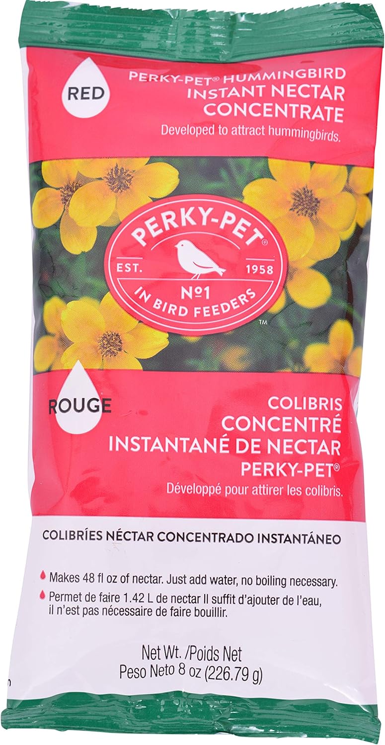 Perky-Pet Original Red Instant Nectar provides the highest amount of energy to hummingbirds by using 100% sucrose. The 8 oz. bag makes 48 oz. of hummingbird nectar. This hummingbird nectar concentrate is so easy to use! Simply stir in water and there's no boiling required. Mixing Instructions: Mix 4 Teaspoons of nectar concentrate for every 3 fl. oz. of water until you reach the desired amount of nectar solution.