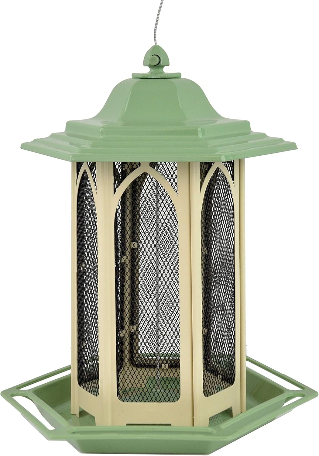Make your backyard The go-to hangout spot for wild birds with the Perky-Pet Pistachio gazebo feeder! This feeder boasts a wraparound seed tray that allows Birds to perch anywhere around the feeder. It also prevents messes by helping to catch dropped seeds. With the ability to holdup to 3.5 lb of mixed seed, your favorite backyard Birds won’t be able to resist flocking to your yd! In addition to offering features birds love, this feeder also makes a charming addition to any outdoor setting with its quaint gazebo-style design. For your convenience, The wide-mouth opening ensures easy filling & cleaning. The patented Sure-Lock cap locks the lid in place to keep squirrels out of the reservoir. Built-in drainage holes in the tray allow proper air flow to prevent water from settling so the seed stays dry – no more seed waste! The metal lid & mesh windows offer additional squirrel resistance, while the metal’s powder-coated finish prevents rust. You can be sure this feeder will Remain a focal pt. In your yd for years to come.