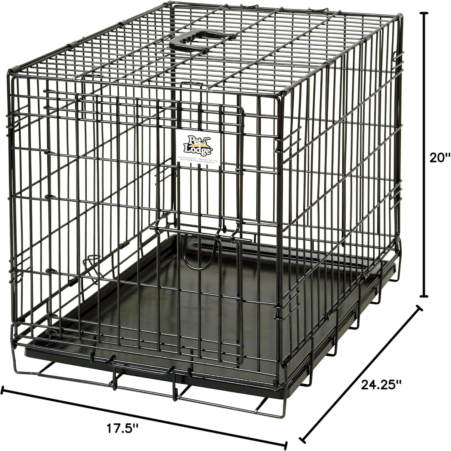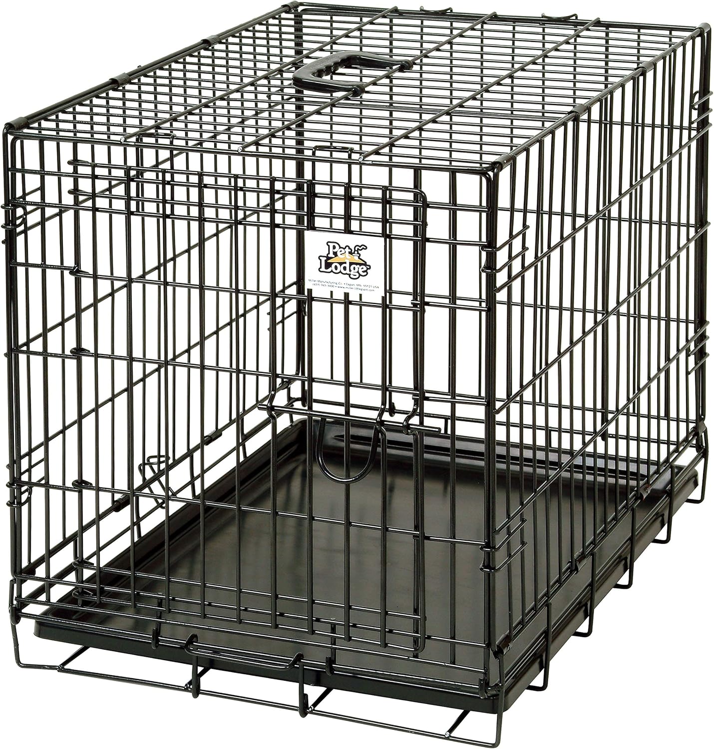 This multi-functional pet crate easily adapts for home, travel, and training purposes. Secure latches will not jiggle loose when in downward locked position. Made of heavy-duty black metal, e-coated for corrosion resistance, with rounded corners on all panels to help ensure safety for owner and pet. Popular suitcase-style crate with removable plastic carrying handle sets up in seconds and folds down for compact storage. Includes removable, easy-to-clean ABS plastic tray. Comes collapsed but fully assembled.