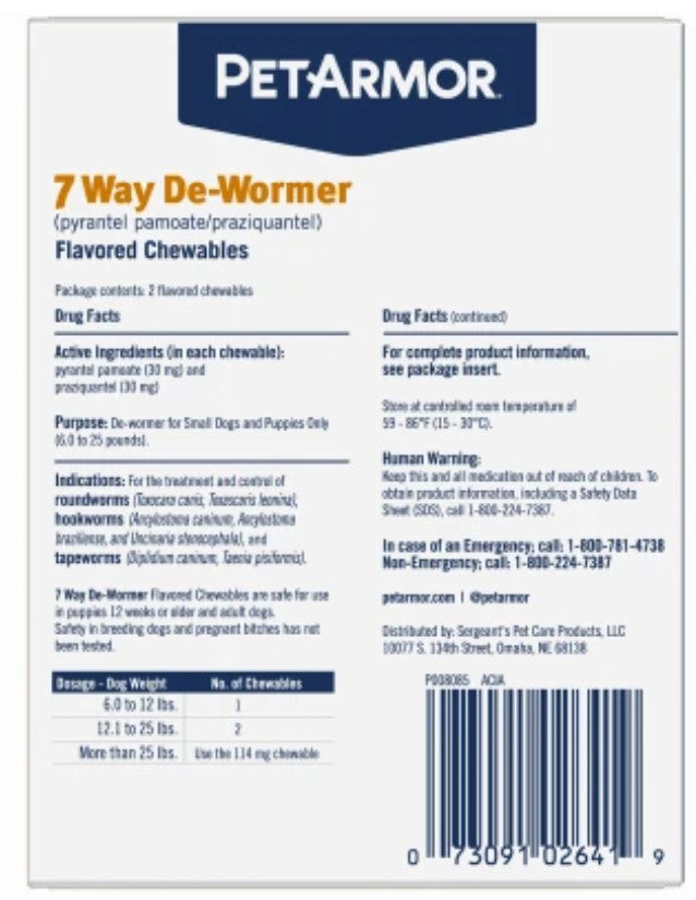 Your pets are family, and PETARMOR helps you confidently care for them with vet-quality parasite protection. The PETARMOR 7 Way Chewable De-Wormer is designed to treat and control roundworms, tapeworms, and hookworms in medium and large dogs weighing 25.1 to 200 pounds. Safe for dogs and puppies 12 weeks or older, this convenient solution helps maintain your pet’s health without the expense of a vet visit.