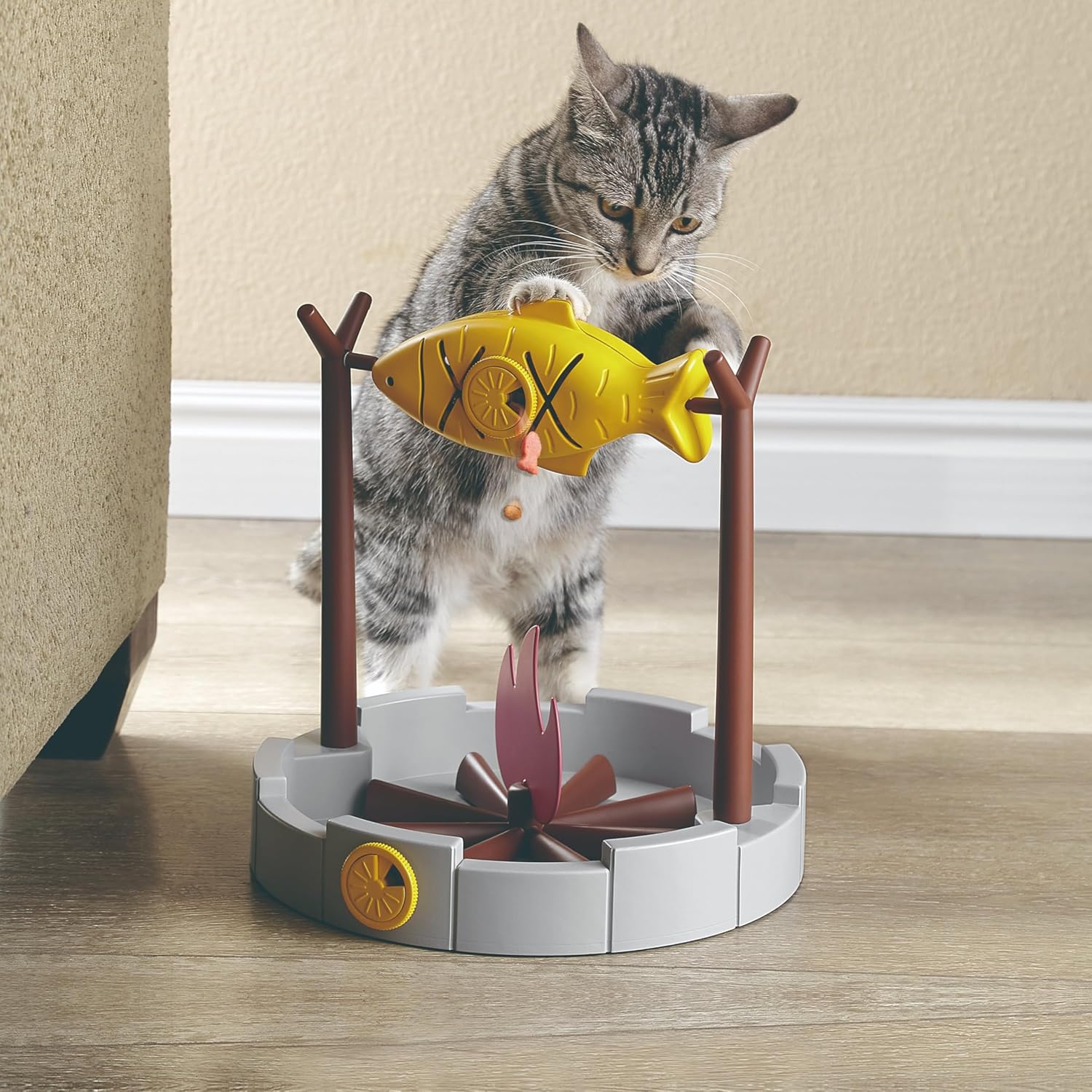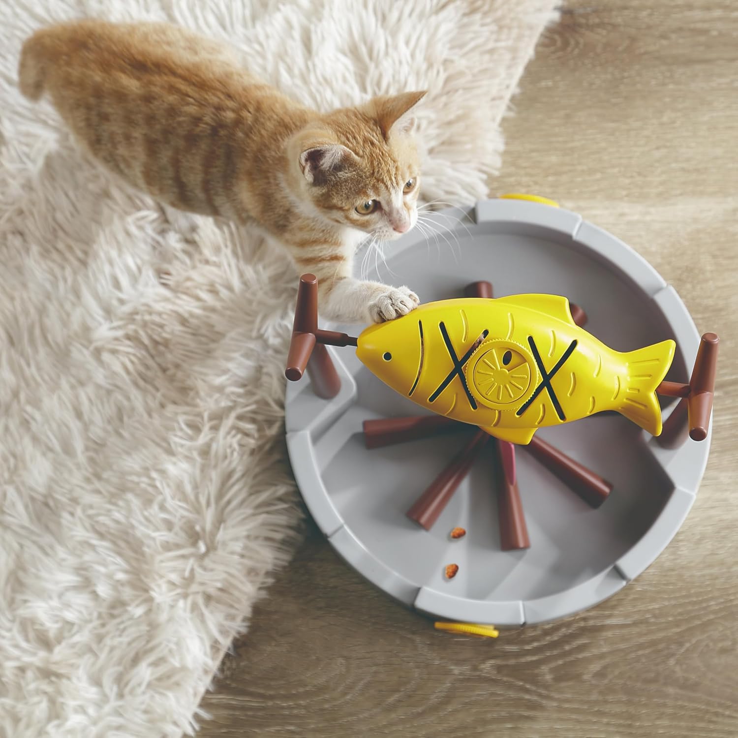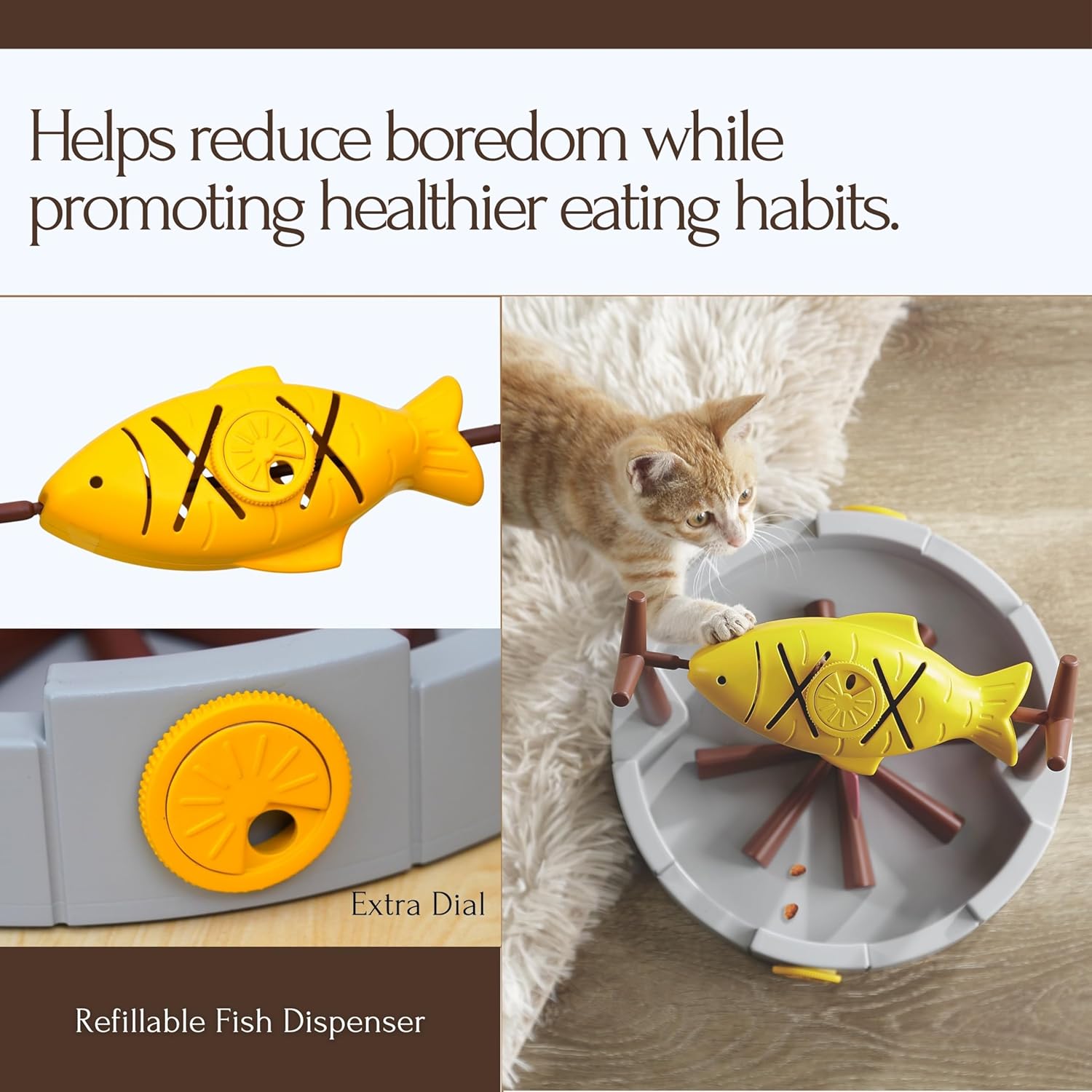 PetPals 11" High Cats Treat-Dispensing Slow Feeder,Pets Dry Food Dispenser,Cats Slow Feeding Snack Bowl, Grilled Fish Spinning Toy, Food Puzzle Cat Toy
