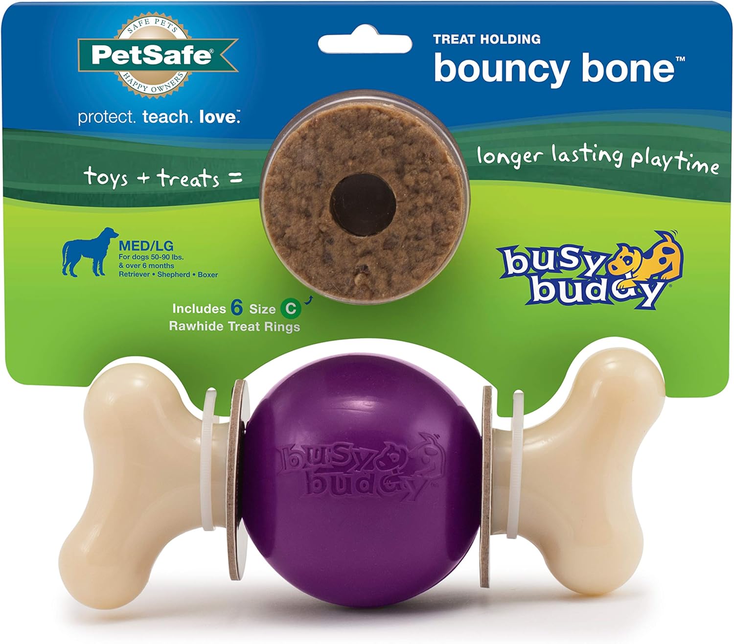 PetSafe Busy Buddy Bouncy Bone Dog Toy - Treat-Holding Toys for Dogs- Scented for Enhanced Sensory Stimulation- Rigorously Tested Ingredients- for Aggressive Chewers- Treat Refills Available - M/L