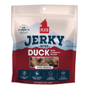 Brand: Plato Pet Treats Animal: Dog Diet: Grain Free Treat Form: Jerky Duck, flaxseed, tapioca starch, lentil flour, coconut glycerin, cranberry,...