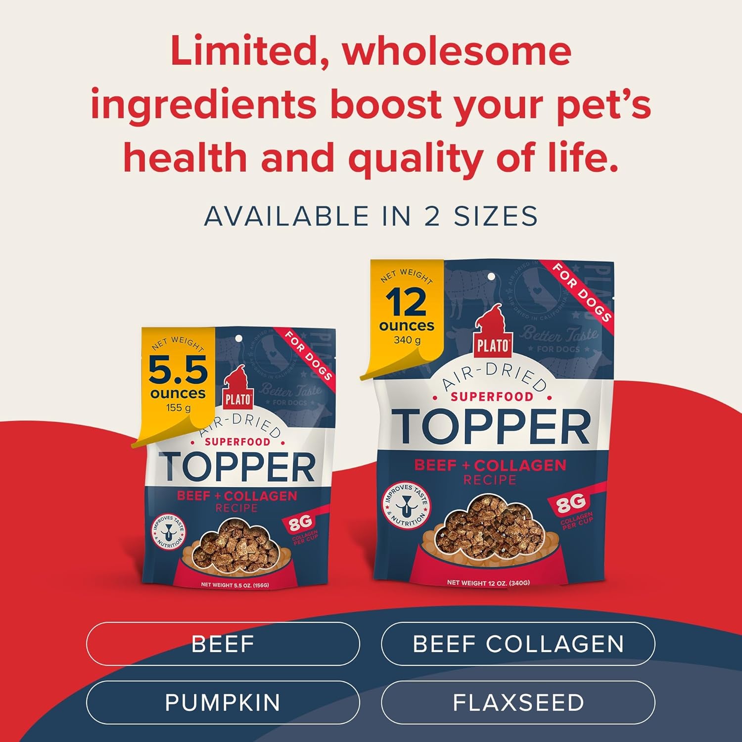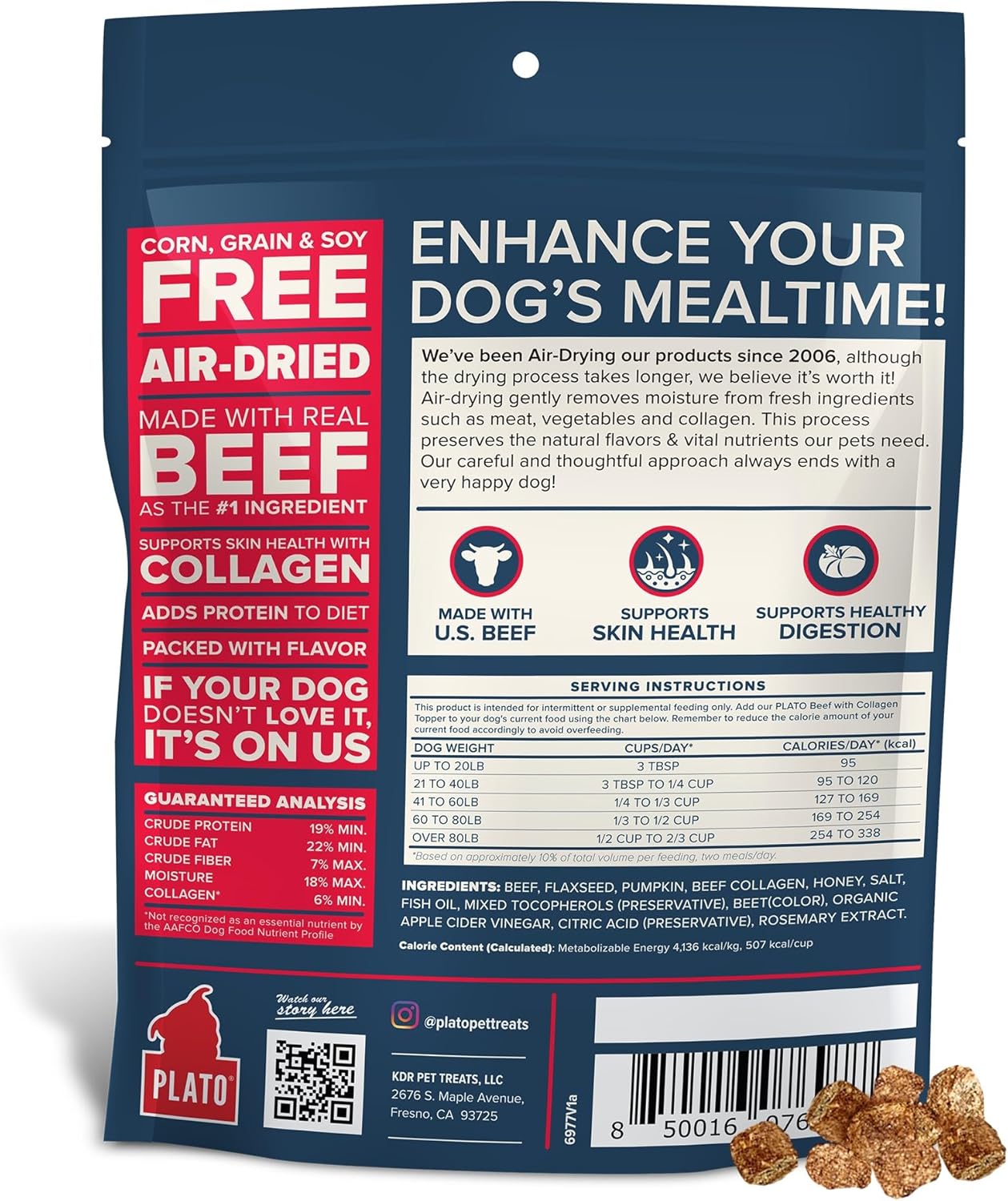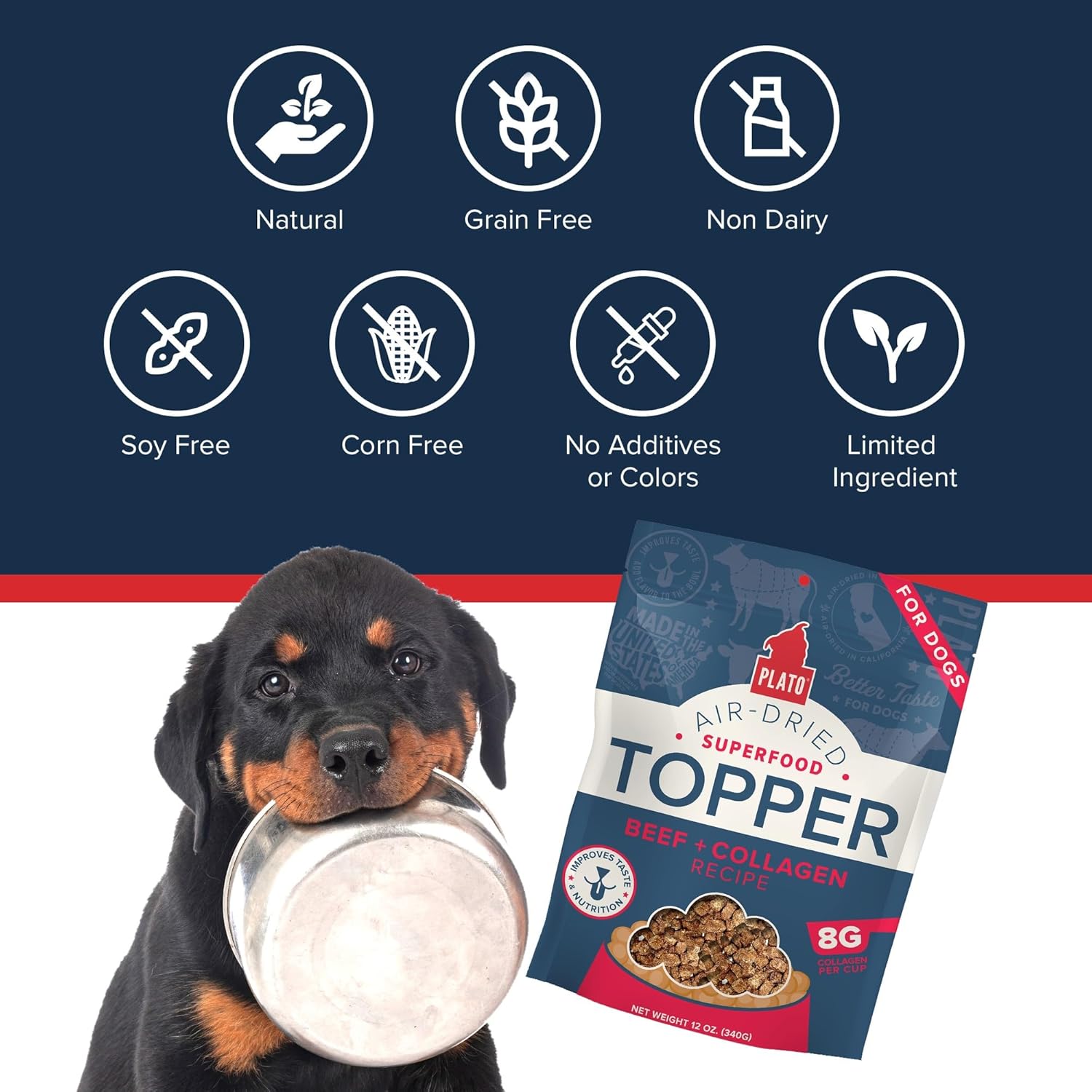 PLATO Pet Treats Dog Food Toppers - Air-Dried Dog Food Toppers for Dry Food - with Collagen to Support Skin and Coat Health - Beef and Collagen Recipe