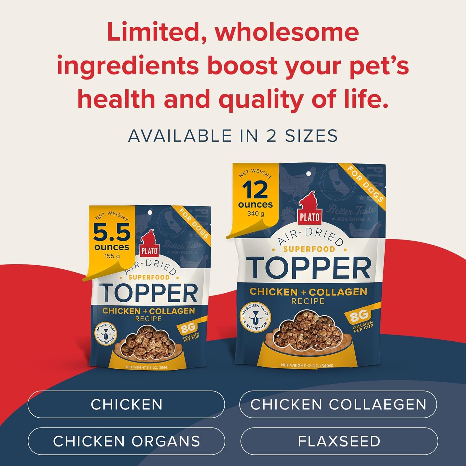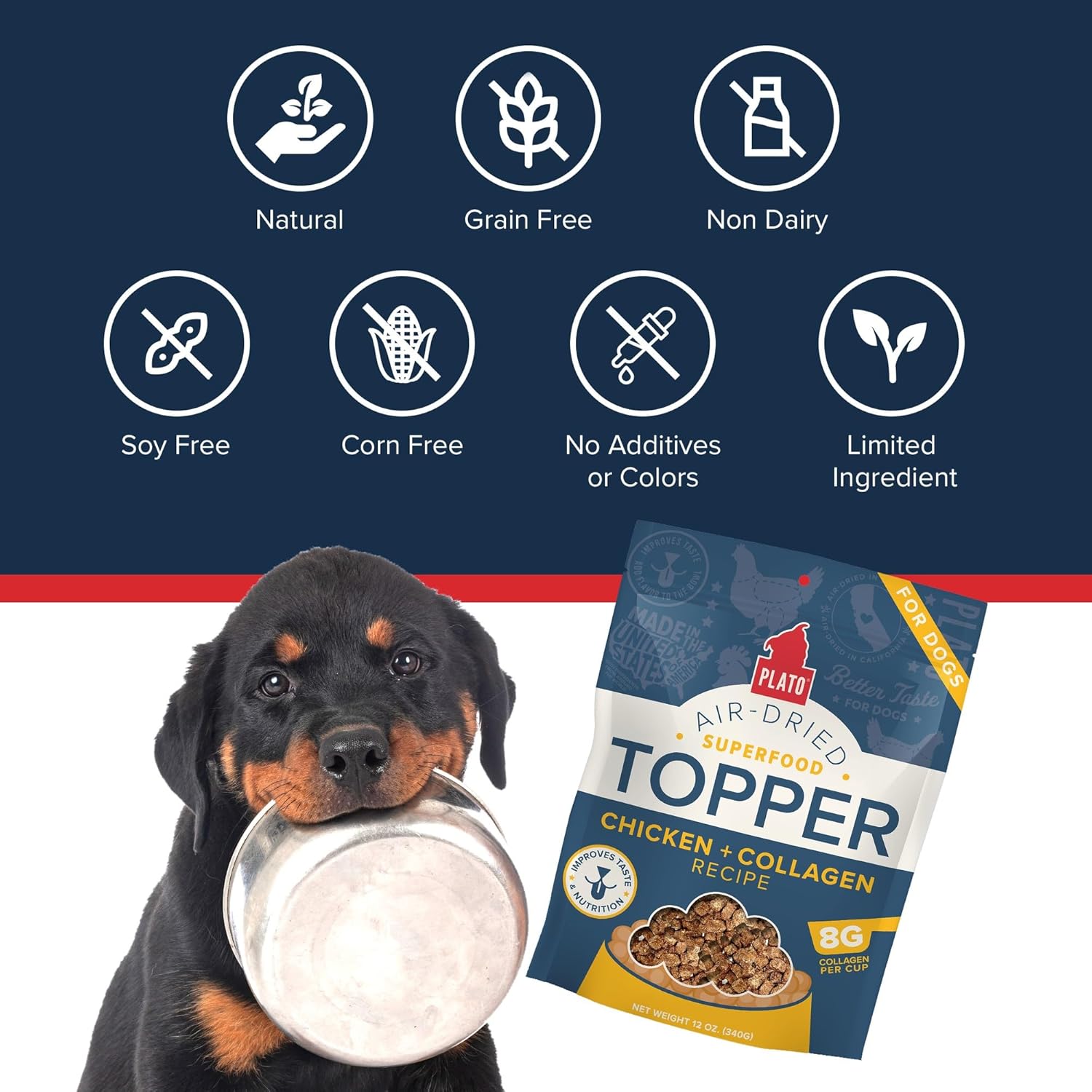 PLATO Pet Treats Dog Food Toppers - Air-Dried Dog Food Toppers for Dry Food - with Collagen to Support Skin and Coat Health - Chicken and Collagen Recipe