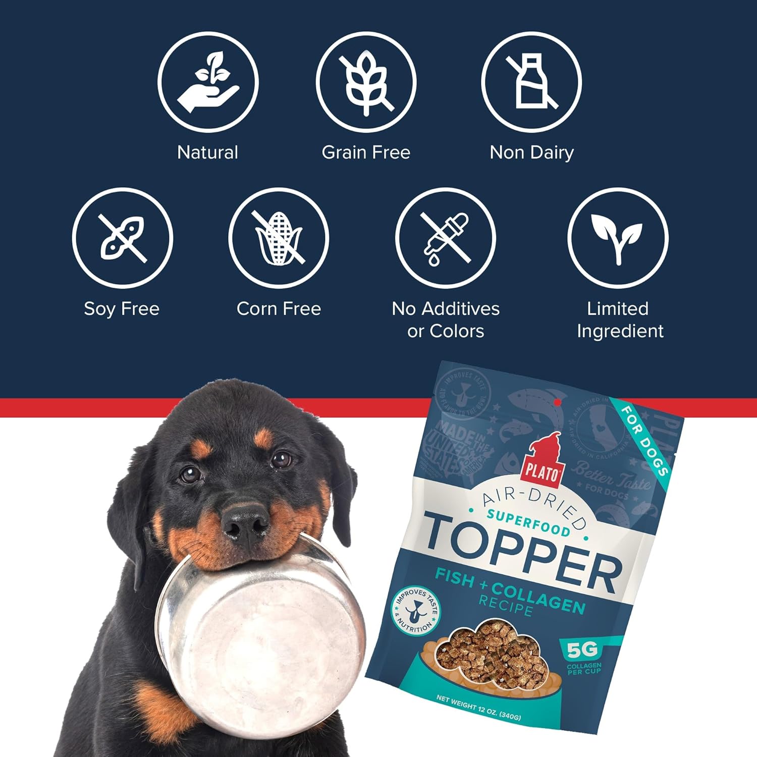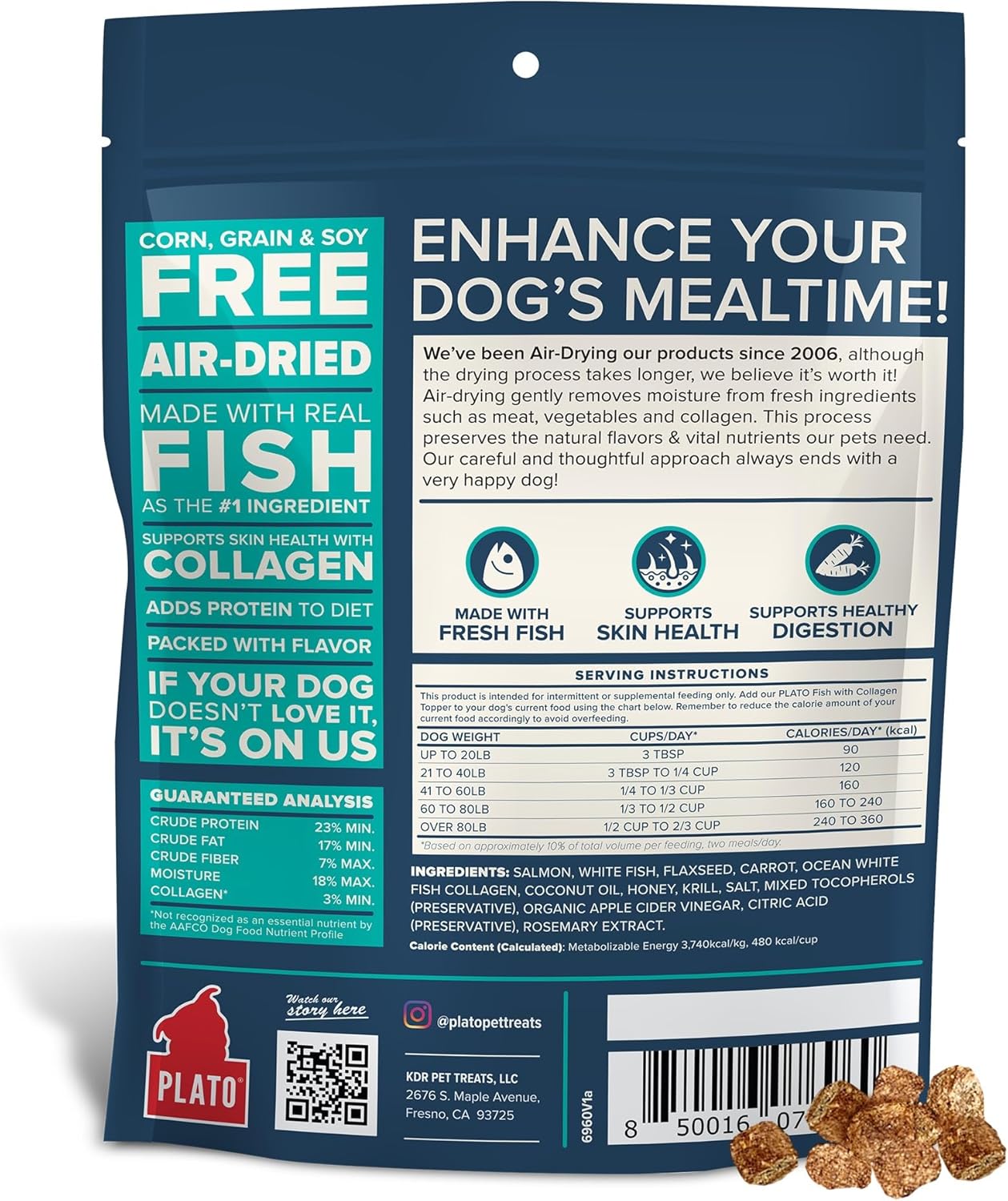 PLATO Pet Treats Dog Food Toppers - Air-Dried Dog Food Toppers for Dry Food - with Collagen to Support Skin and Coat Health - Fish and Collagen Recipe