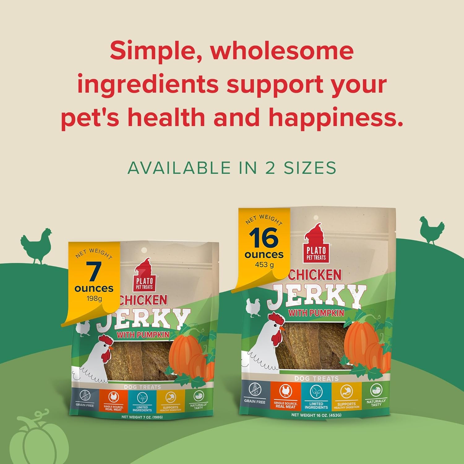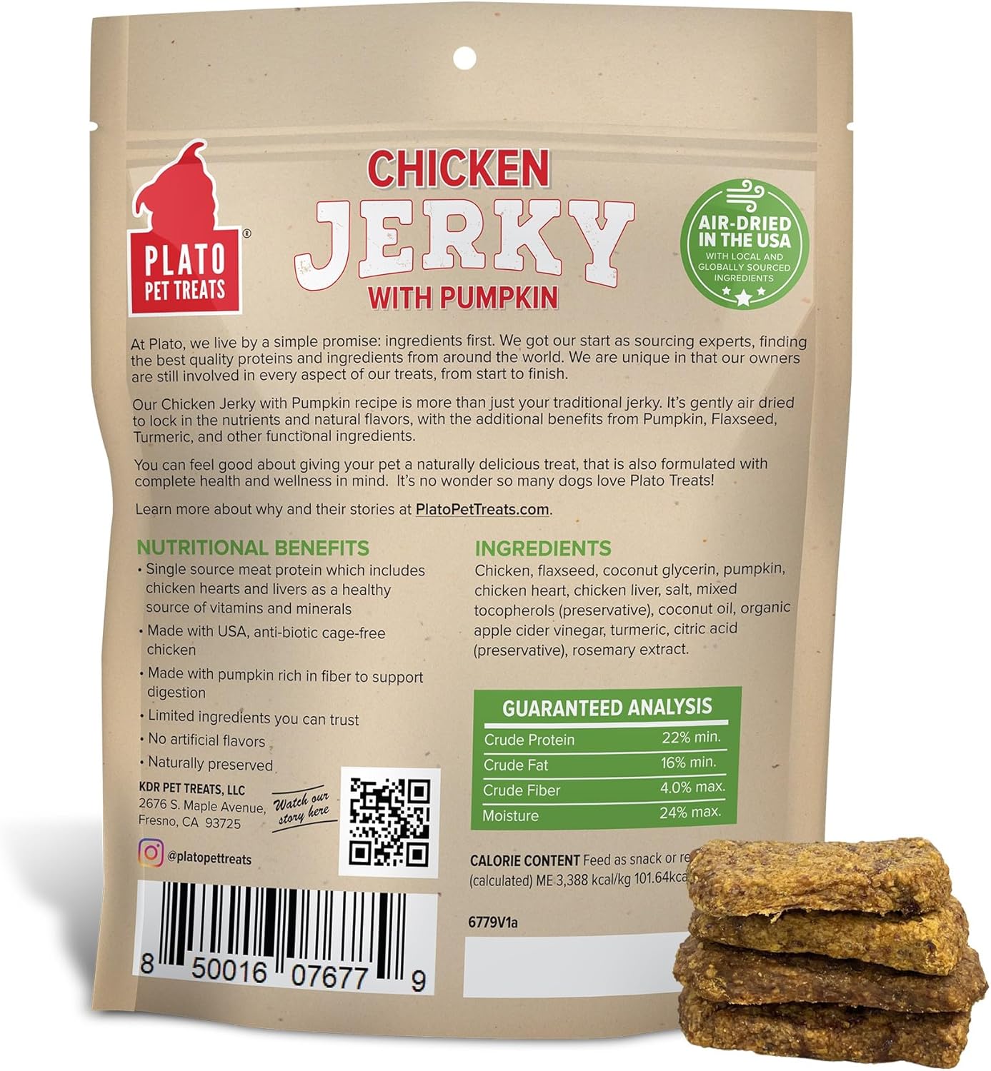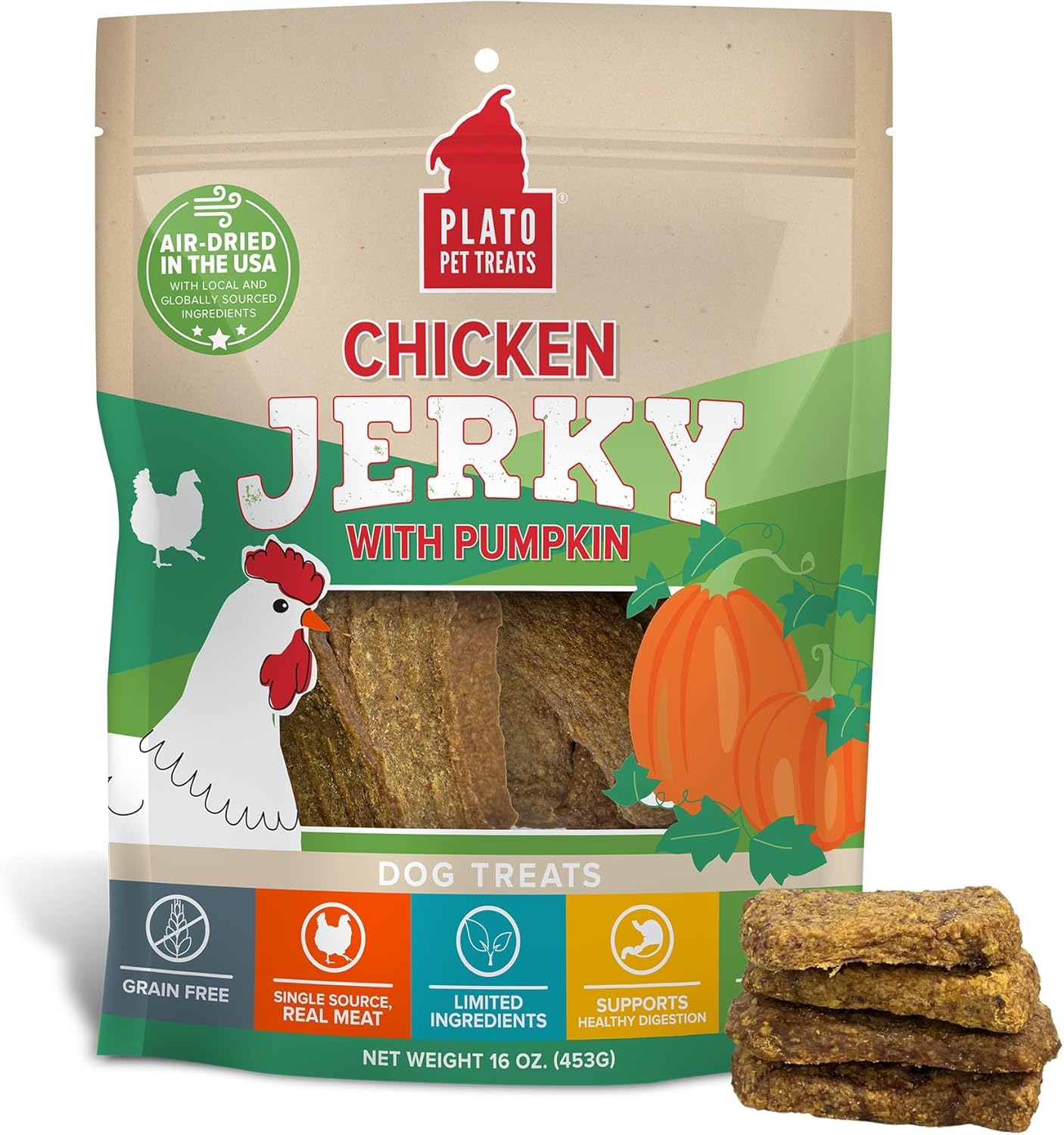 PLATO Pet Treats Dog Treats - Air-Dried Jerky for Dogs - Delicious, Real Meat Dog Treats - Grain Free - Supports Healthy Digestion - Chicken Jerky with Pumpkin