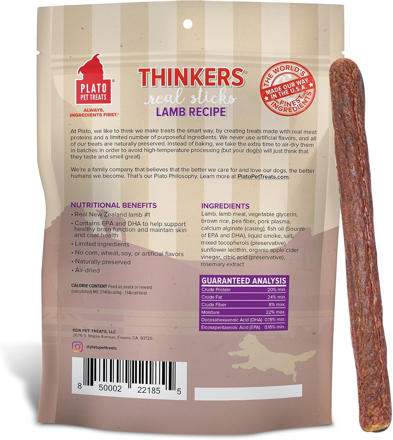 Plato Pet Treats Thinkers - Meat Sticks for Dogs - Limited Ingredient Treats with EPA and DHA to Support Skin, Coat, and Brain - Air-Dried - Lamb