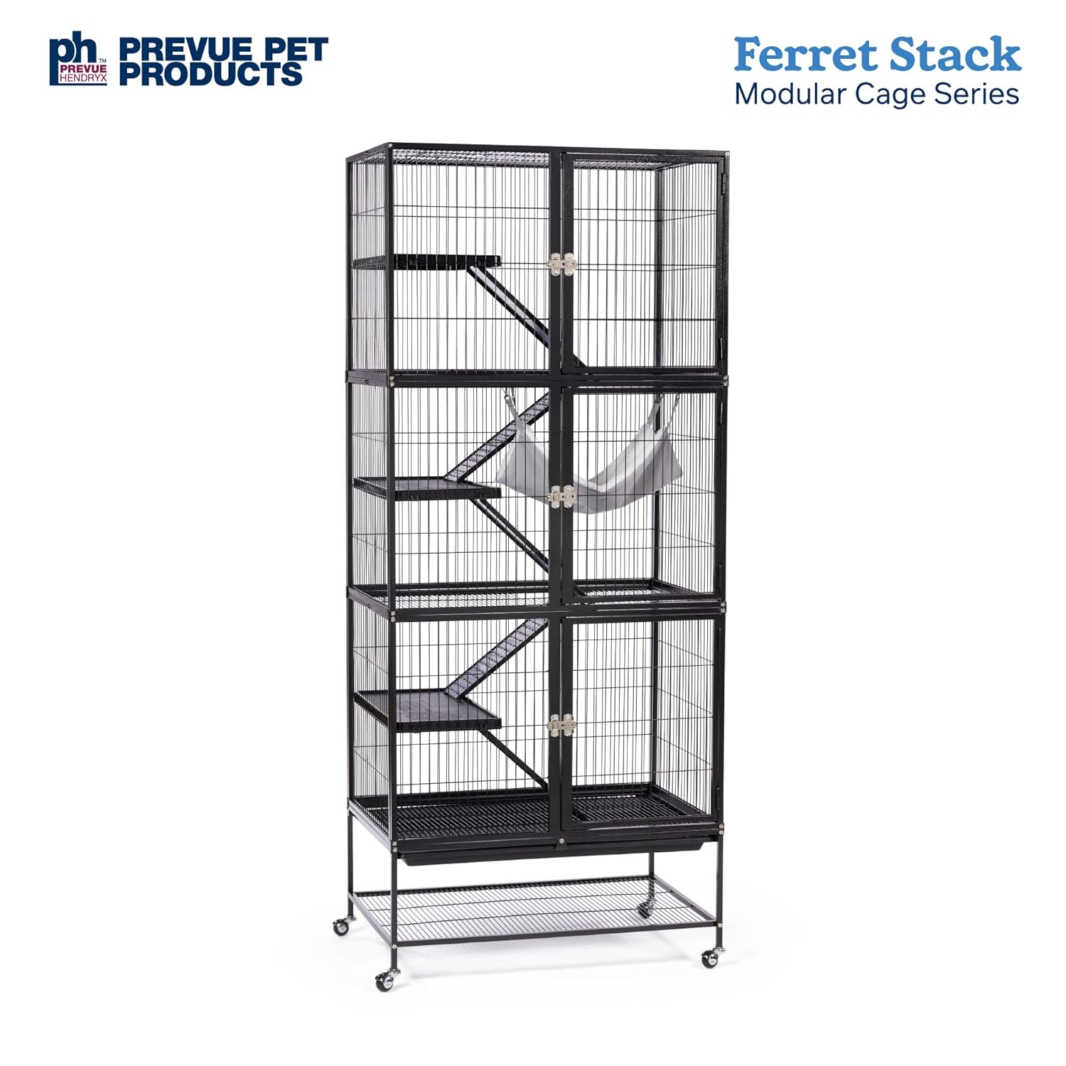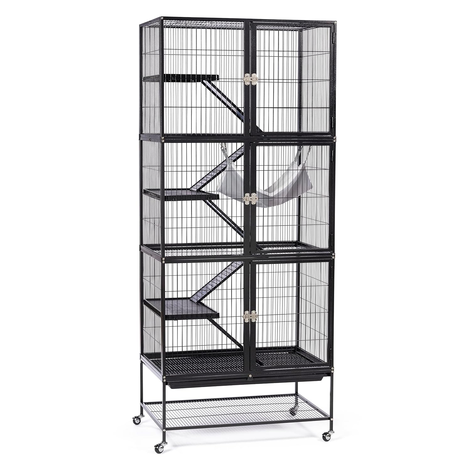 - A three story cage with rolling casters, integrated storage shelf, large front doors with escape-proof locks