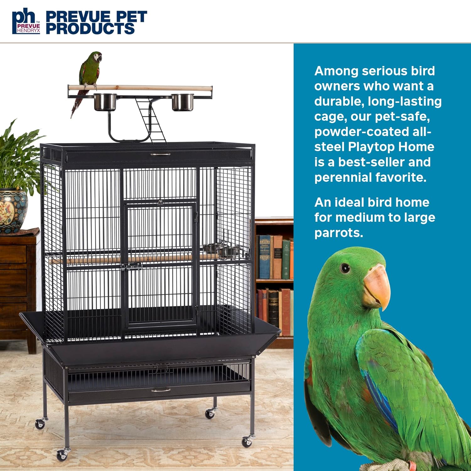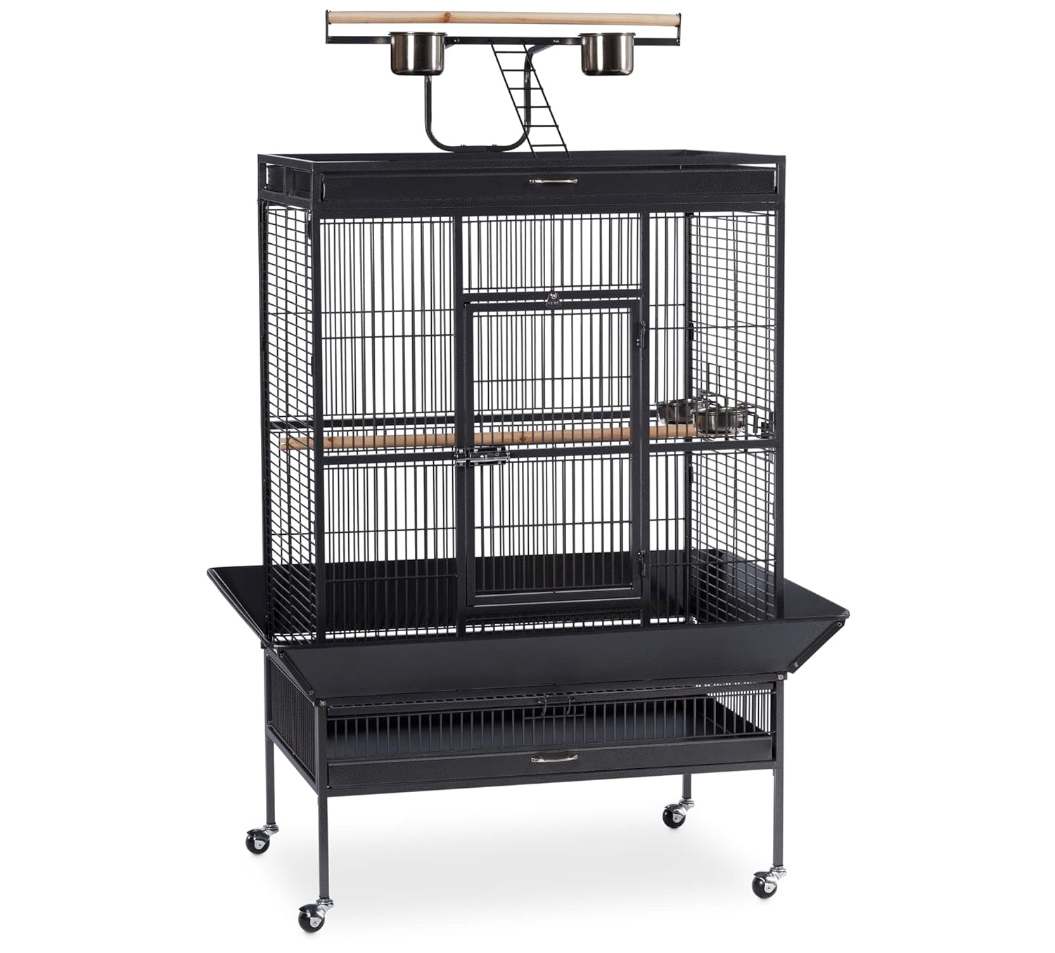 - 4 Stainless steel cups, 2 wood perches, cage stand, playtop and rounded seed guards are included