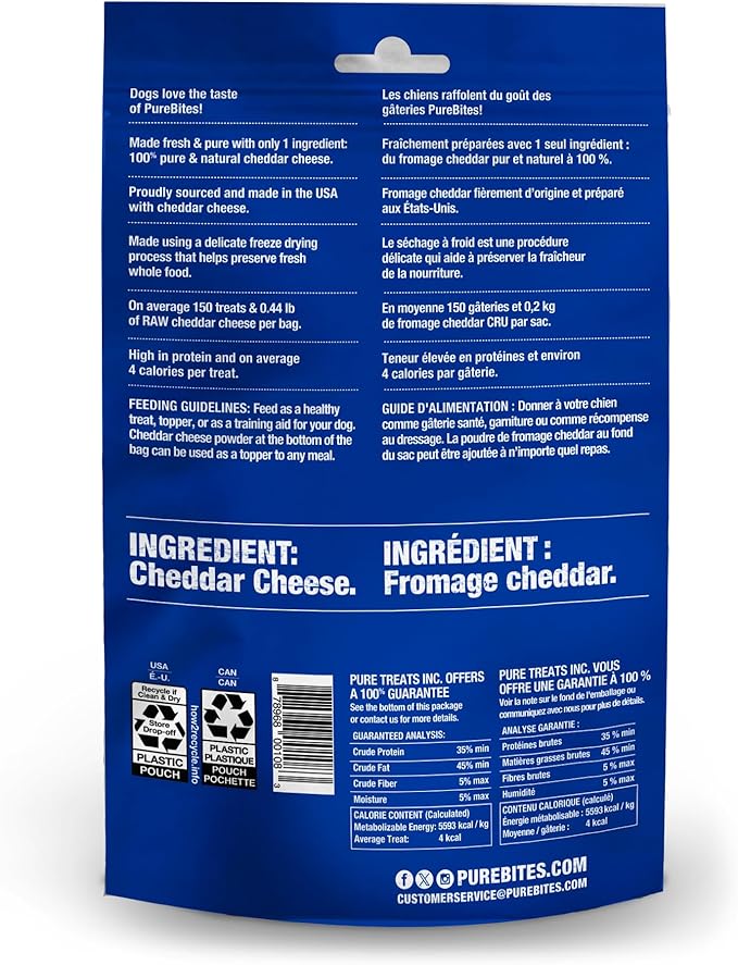 Brand PureBites Flavor Cheese Age Range (Description) All Life Stages Item Form Frozen Special Ingredients Cheddar Cheese...