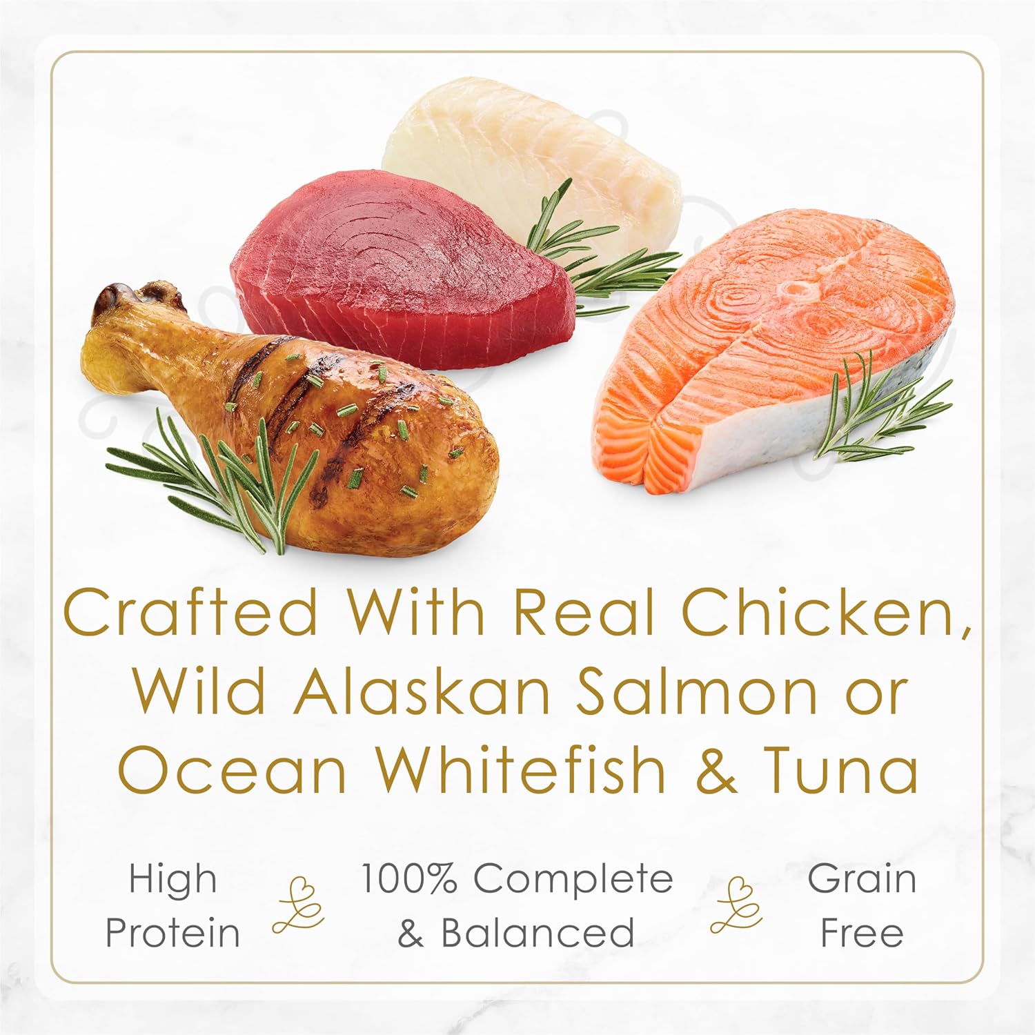 - Single serving with real ocean whitefish and tuna, chicken or salmon cat food, and no artificial preservatives or colors