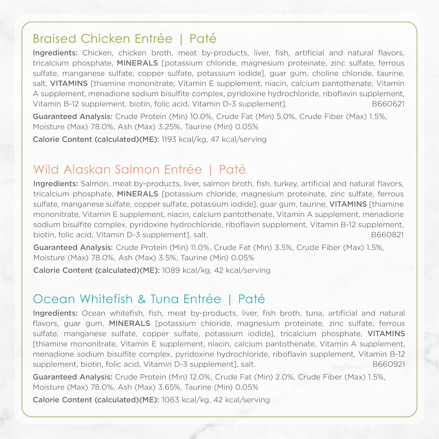 IngredientsChicken: Chicken, Chicken Broth, Meat By-Products, Liver, Fish, Artificial And Natural Flavors, Tricalcium Phosphate, MINERALS [Potassium Chloride, Magnesium Proteinate, Zinc Sulfate, Ferrous Sulfate, Manganese Sulfate, Copper Sulfate, Potassium Iodide], Guar Gum, Choline Chloride, Taurine, Salt, VITAMINS [Thiamine Mononitrate, Vitamin E Supplement, Niacin, Calcium Pantothenate, Vitamin A Supplement, Menadione Sodium Bisulfite Complex, Pyridoxine Hydrochloride, Riboflavin Supplement, Vitamin B-12 Supplement, Biotin, Folic Acid, Vitamin D-3 Supplement]. B660621 Salmon: Salmon, Meat By-Products, Liver, Salmon Broth, Fish, Turkey, Artificial And Natural Flavors, Tricalcium Phosphate, MINERALS [Potassium Chloride, Magnesium Proteinate, Zinc Sulfate, Ferrous Sulfate, Manganese Sulfate, Copper Sulfate, Potassium Iodide], Guar Gum, Taurine, VITAMINS [Thiamine Mononitrate, Vitamin E Supplement, Niacin, Calcium Pantothenate, Vitamin A Supplement, Menadione Sodium Bisulfite Complex, Pyridoxine Hydrochloride, Riboflavin Supplement, Vitamin B-12 Supplement, Biotin, Folic Acid, Vitamin D-3 Supplement], Salt. B660821 Ocean Whitefish & Tuna: Ocean Whitefish, Fish, Meat By-Products, Liver, Fish Broth, Tuna, Artificial And Natural Flavors, Guar Gum, MINERALS [Potassium Chloride, Magnesium Proteinate, Zinc Sulfate, Ferrous Sulfate, Manganese Sulfate, Copper Sulfate, Potassium Iodide], Tricalcium Phosphate, VITAMINS [Thiamine Mononitrate, Vitamin E Supplement, Niacin, Calcium Pantothenate, Vitamin A Supplement, Menadione Sodium Bisulfite Complex, Pyridoxine Hydrochloride, Riboflavin Supplement, Vitamin B-12 Supplement, Biotin, Folic Acid, Vitamin D-3 Supplement], Salt. B660921