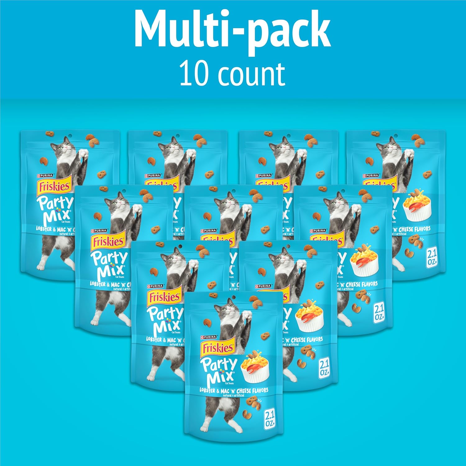 - Friskies Lobster Mac 'N' Cheese flavored cat treats with pieces that feature a combination of crunchy and tender textures