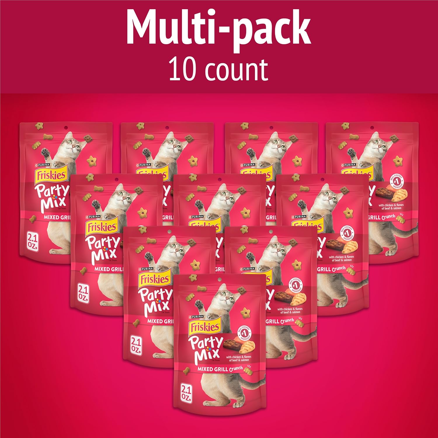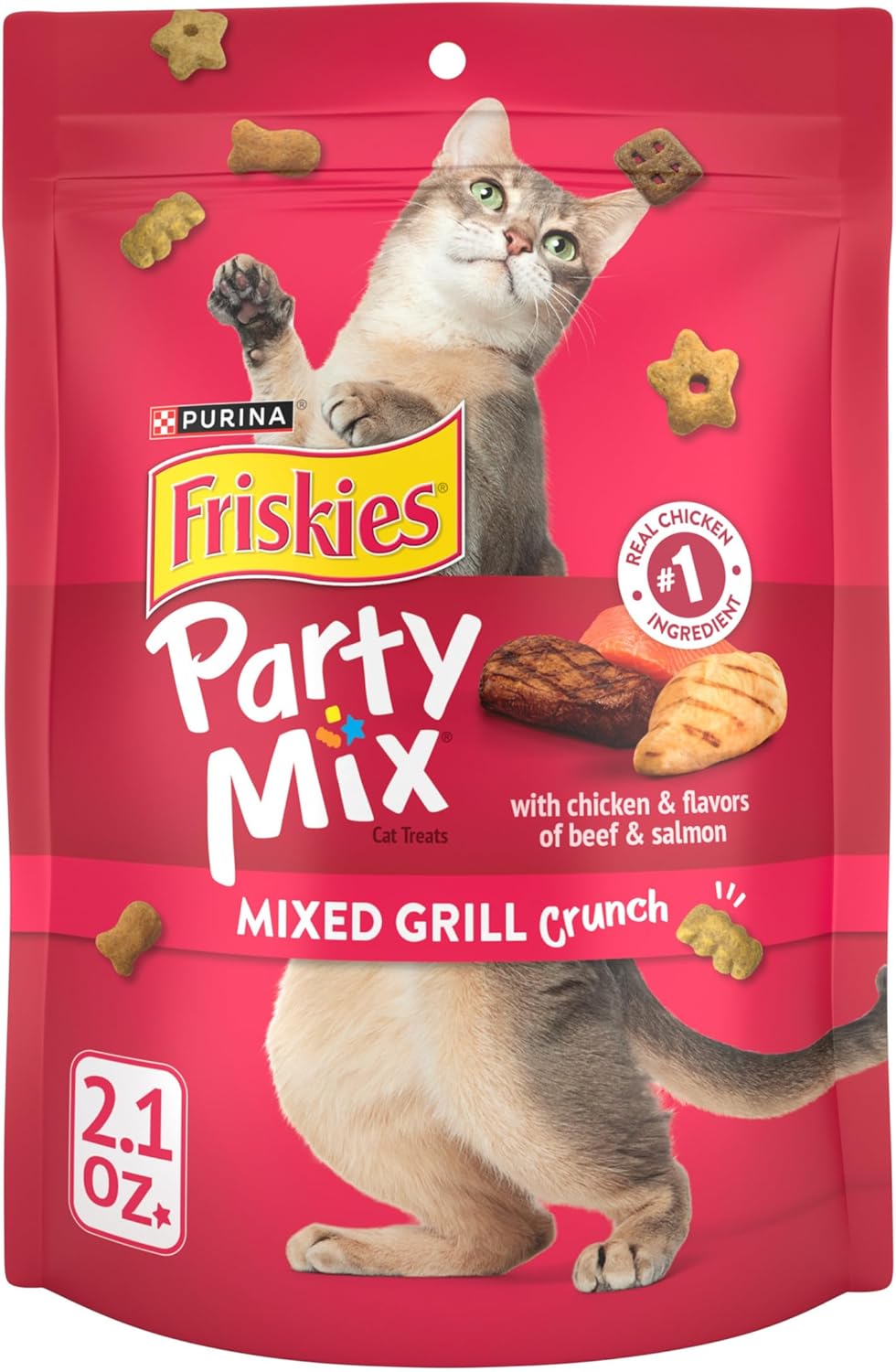 - Part of the complete line of Purina Friskies cat foods and treats, Purina Friskies Party Mix Mixed Grill Crunch adult treats for cats are crafted in Purina-owned U.S. facilities